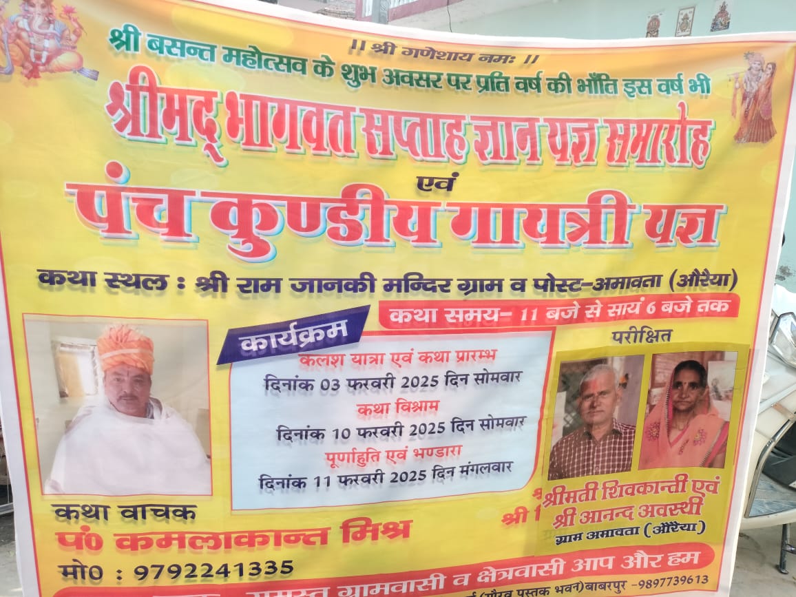 कलश शोभा यात्रा में बैंड बाजों के माताओं व बहनों ने अमावता नहर पुल से जल भरकर सम्पूर्ण गांव के स्थिति मंदिरों से भ्रमण करते हुए श्री राम जानकी मंदिर पर पहुंचे। श्रीमद् भागवत सप्ताह ज्ञान यज्ञ कथा में परीक्षित श्रीमती शिवकांति अवस्थी एवं श्री आनन्द अवस्थी निवासी अमावता बनें।