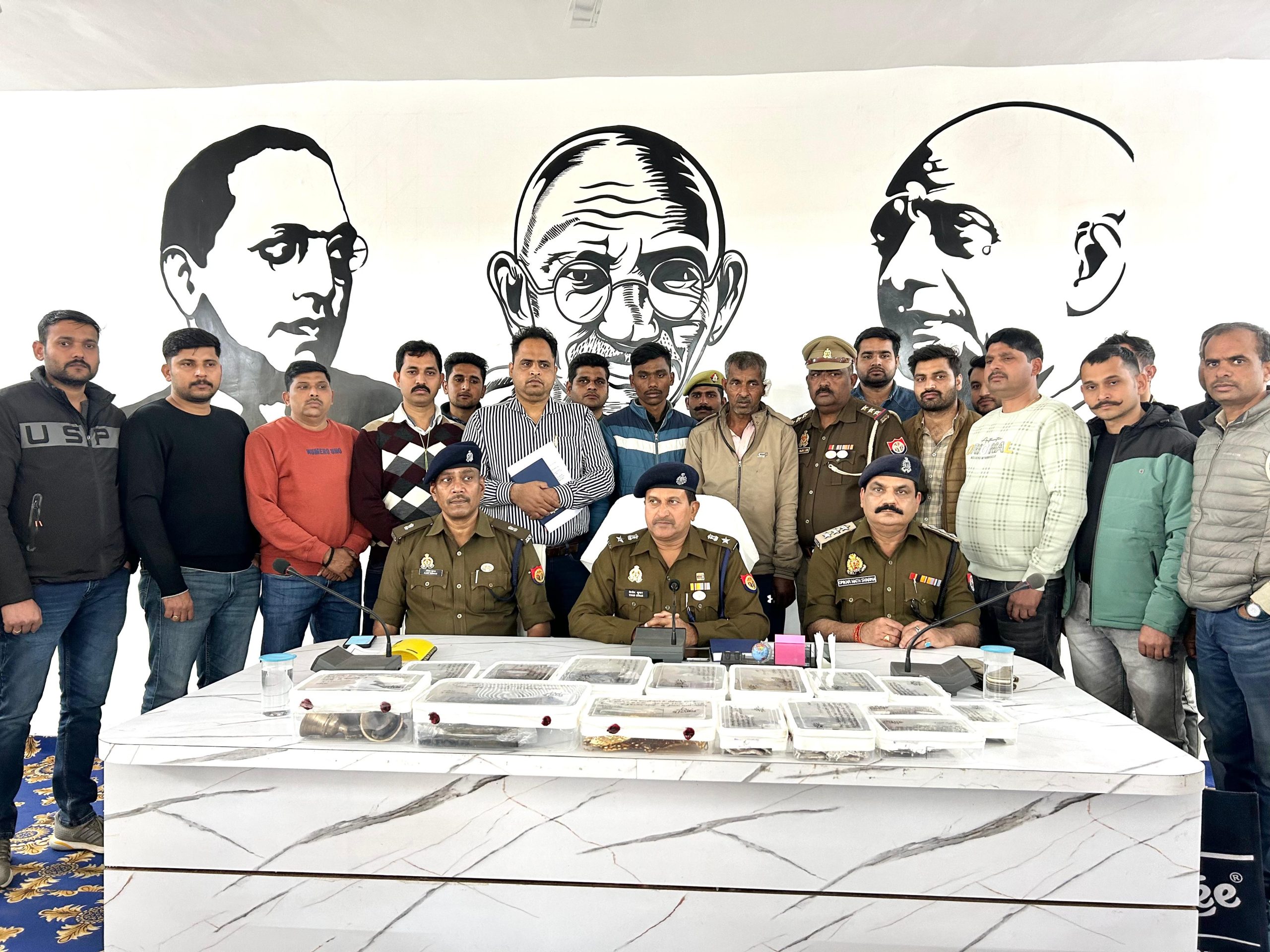 *एस0ओ0जी0 /सर्विलान्स /थाना छिबरामऊ की संयुक्त टीम द्वारा अन्तर्राज्यीय एतिहासिक धरोहर और मन्दिरों आदि में डकैती व चोरी करने वाले गिरोह का सरगना कुँवरपाल बंजारा सहित 01 साथी को किया गया गिरफ्तार, कब्जे से चांदी (चांदी का मुकुट, छत्र, स्वास्तिक वर्तन, चरण पादुका आदि) वजन करीब 2 किलो 261 ग्राम, 03 अदद पीतल के घन्टे, 40 हजार 630 रूपये नगद, मन्दिर में सजावट में प्रयुक्त होने वाली पीतल वस्तु के टुकडे 2 किलो 210 ग्राम, 01 अदद डी0बी0आर0 व घटनाओं में प्रयुक्त एक अदद कटर बरामद।*कन्नौज ब्यूरो दर्शन राजपूत के साथ राहुल कुमार की रिपोर्ट पुलिस अधीक्षक कन्नौज विनोद कुमार द्वारा अपराध एवं अपराधियों के विरूद्ध चलाये जा रहे अभियान के क्रम में, अपर पुलिस अधीक्षक कन्नौज अजय कुमार के मार्ग दर्शन में, क्षेत्राधिकारी छिबरामऊ ओमकार नाथ शर्मा के पर्यवेक्षण में, एस0ओ0जी0 टीम/सर्विलान्स टीम/थाना छिबरामऊ की संयुक्त टीम द्वारा थाना छिबरामऊ क्षेत्रान्तर्गत कालका मन्दिर व बाबा की बगिया हनुमान मन्दिर में चोरी की घटना कारित करने वाले 02 अभियुक्तगण को किया गिरफ्तार ।*संक्षिप्त विवरण* दिनांक 20.01.2025 को देवेन्द्र कुमार चतुर्वेदी निवासी सौरिख रोड छिबरामऊ जनपद कन्नौज अध्यक्ष कालिका देवी सेवा समिति सौरिख रोड छिबरामऊ जनपद कन्नौज ने कालिका देवी मन्दिर से अज्ञात चोरों द्वारा मन्दिर के अन्दर का ताला तोडकर व खिड़की की ग्रिल काटकर ,मन्दिर एवं कमरे व दानपात्र से (सोने चांदी के जेवरात,चांदी के छत्र, चांदी के मुकुट,घण्टा व चढावा के रुपये) चोरी कर ले जाने के सम्बन्ध में थाना छिबरामऊ पर मु0अ0सं0-0042/25 धारा 331(4)/305(d) BNS बनाम अज्ञात तथा मदनलाल पुत्र रघुनाथ प्रसाद निवासी बहवलपुर थाना छिबरामऊ जनपद कन्नौज ने प्राचीन हनुमान मंदिर में रखे दानपात्र को खोलकर चोरी कर लेने के सम्बन्ध में थाना छिबरामऊ पर मु0अ0सं0-0043/25 धारा 305(d) BNS बनाम अज्ञात पंजीकृत किया गया है। जिसके क्रम में दिनांक 06.02.2025 को मुखविर खास की सूचना पर सर्विलान्स सेल, एस0ओ0जी0 एवं थाना छिबरामऊ की संयुक्त टीम द्वारा थाना छिबरामऊ क्षेत्रान्तर्गत खुबरियापुर मोड से अभियुक्तगण कुँवरपाल बंजारा पुत्र नरपत सिंह बंजारा नि0 रामनगर थाना ठठिया जनपद कन्नौज व सौरभ राजपूत पुत्र अजय राजपूत नि0 मो0 अन्नपूर्णानगर थाना तिर्वा जनपद कन्नौज को गिरफ्तार किया गया, जिनके कब्जे से चांदी के (मुकुट, छत्र, स्वास्तिक, बर्तन, चरण पादुका आदि) वजन करीब 2 किलो 261 ग्राम व 03 अदद पीतल के घन्टे व मन्दिर में सजावट में प्रयुक्त होने वाली पीतल वस्तु के टुकडे 2 किलो 210 ग्राम, 01 अदद डी0बी0आर0 व घटनाओं में प्रयुक्त एक अदद कटर व 40 हजार 630 रूपये नगद तथा थाना सिविल लाइन जनपद इटावा पर मु0अ0सं0-4/25 धारा-331(4), 305(डी) बी0एन0एस0 व थाना टूंडला जनपद फिरोजाबाद पर मु0अ0सं0-46/25 