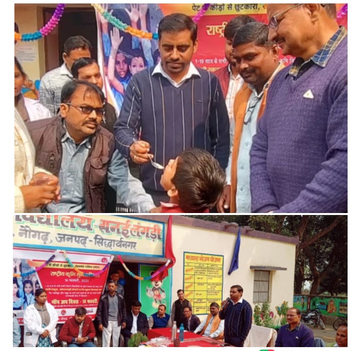 विकास खण्ड नौगढ़ अन्तर्गत प्राथमिक विद्यालय सोनवल में सोमवार को राष्ट्रीय कृमि मुक्ति दिवस कार्यक्रम का आयोजन किया गया। विद्यालय में मुख्य विकास अधिकारी जयेन्द्र कुमार और मुख्य चिकित्साधिकारी डॉ0 रजत कुमार चौरसिया द्वारा बच्चों को कृमि रोधी गोली खिलाकर कार्यक्रम का शुभारम्भ किया गया। इस कार्यक्रम के अन्तर्गत सभी उपस्थित बच्चों को कृमि रोधी गोली खिलाया गया। मुख्य विकास अधिकारी द्वारा बच्चों को कृमि रोधी दवा के फायदे के बारें में जानकारी देते हुये सभी बच्चों तथा ग्राम के अन्य सभी बच्चों को दवा खाने के प्रेरित किया गया। मुख्य चिकित्साधिकारी द्वारा कृमि के लक्षण और दवा खाने के लाभ के बारें में विस्तृत जानकारी दी गयीं एवं छुटे हुए बच्चों को मॉप अप राउण्ड 14 फरवरी 2025 को खिलाये जाने के बारें में बताया गया। इस अवसर पर भाजपा मण्डल अध्यक्ष महेन्द्र लोधी, नोडल अधिकारी डॉ0 वी0एन0 चतुर्वेदी, जनपद व ब्लाक स्तरीय अधिकारीगण, प्रधानाचार्य, शिक्षक, एएनएम, आशा व आगनवाड़ी आदि लोग मौजूद रहीं।