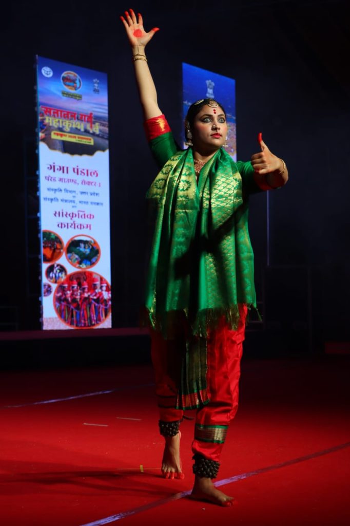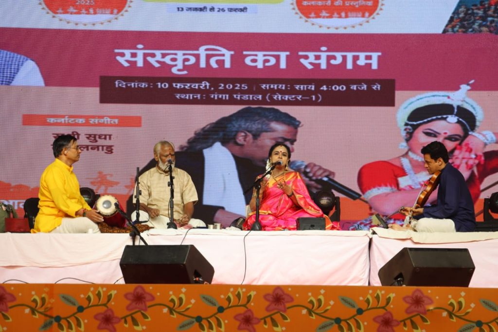 प्रयागराज। महाकुम्भ गंगा पण्डाल आज दिनांक 10 फरवरी को राग और स्वरों के समिश्रण से गुंजायमान हुआ। सबसे पहले गुरु मुत्तुस्वामी पिल्लई पुरस्कार से सम्मानित नाट्यकलावर्दिनी युवा भरतनाट्यम कलाकार कृपा रवि ने नाट्यमंचन से मंच की शोभा बढ़ाया। देश विदेश के विभिन्न मंचों सहित हम्पी महोत्सव, राजभवन, गुजरात, कुम्भकोणम जैसे स्थानों पर अपनी प्रतिभा बिखेर चुकी तथा पद्मश्री आनंदा शंकर जयंत तथा श्रीमती डॉली देसाई, श्रीमती जयालक्ष्मी ईश्वर की शिष्या कृपा रवि ने आज माता दुर्गा को दर्शाते हुए वर्णम प्रस्तुत किया, जिसमे अभिनय एवं नृत्य का समिश्रण स्वरूप होता है। अगले कार्यक्रम में डॉ० राजलक्ष्मी श्रीनिवासन की पुत्री एवं शिष्या डॉ० जयंती एस रवि ने संकीर्तन प्रस्तुत किया। उन्होंने भक्ति रस में भारत की दस भाषाओं संस्कृत, हिंदी, गुरुमुखी, बंगाली, मलयालम, तमिल, कन्नड़, तेलगु, गुजराती, मराठी में एक एक गीत प्रस्तुत किये।