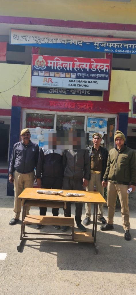 जनपद मुजफ्फरनगर में शातिर अभियुक्त तो की गिरफ्तारी हेतु पुलिस उपमहानिरीक्षक/वरिष्ठ पुलिस अधीक्षक मुजफ्फरनगर श्री अभिषेक सिंह के निर्देशन में चलाये जा रहे अभियान के अन्तर्गत, पुलिस अधीक्षक ग्रामीण श्री आदित्य बंसल तथा क्षेत्राधिकारी फुगाना श्री सन्त प्रसाद उपाध्याय व थानाध्यक्ष फुगाना श्री गजेन्द्र सिंह के नेतृत्व में आज थाना फुगाना पुलिस द्वारा फुगाना चौराहे से 02 अभियुक्तों को गिरफ्तार किया गया। अभियुक्तगण के कब्जे से अवैध शस्त्र मय कारतूस बरामद किये गये। गिरफ्तार संजीव कुमार पुत्र विशम्बर सिंह निवासी गाँव व थाना भौराकलां व अमरपाल पुत्र ब्रहमपाल निवासी गाँव बुडिनाकला थाना तितावी मुजफ्फरनगर को एक तंमचा 315 बोर व दो जिन्दा कारतूस व एक तंमचा 12 बोर व दो जिन्दा कारतूस के साथ गिरफ्तार किया है थाना फुगाना पुलिस द्वारा अग्रिम विधिक कार्यवाही कर जेल भेजा जा रहा है।