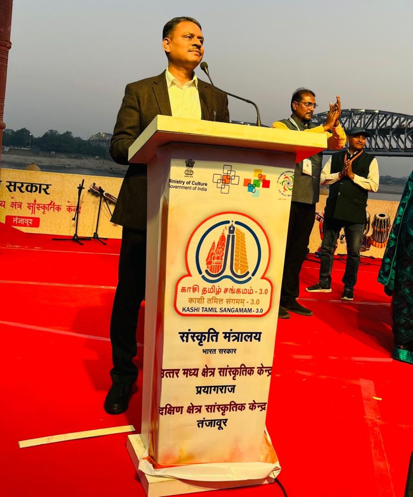 वाराणसी।काशी तमिल संगमम 3.0 के तहत नमो घाट पर आयोजित सांस्कृतिक कार्यक्रम में जिलाधिकारी एस राजलिंगम शामिल हुए।उन्होंने नमों घाट पर कार्यक्रम प्रस्तुत कर रहे उत्तर भारतीय कलाकारों और विभिन्न वाद्य यंत्रों पर सामूहिक नृत्य व गायन कर रहे तमिल कलाकारों का हौसला बढ़ाया।कार्यक्रम को देखने के लिए काफी संख्या में स्थानीय लोग मौजूद रहे।इसके बाद जिलाधिकारी ने तमिलनाडु से आए डेलीगेटस का अंगवस्त्रम और मोमेंटो देकर सम्मानित किया।बता दें कि यह कार्यक्रम संस्कृति मंत्रालय,भारत सरकार के उत्तर मध्य क्षेत्र सांस्कृतिक केंद्र प्रयागराज और दक्षिण क्षेत्र सांस्कृतिक केंद्र तंजावुर द्वारा आयोजित किया जा रहा है।उन्होंने तमिल भाषा में कार्यक्रम को संबोधित भी किया।