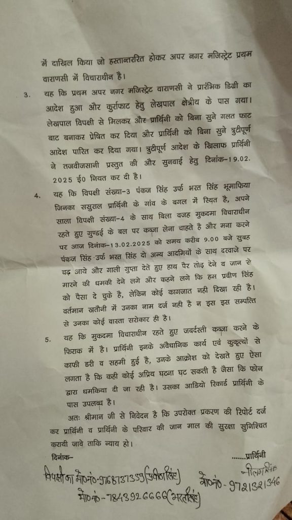 इनकी जमीन को पंकज सिंह उर्फ भरत सिंह जिनका ससुराल प्रार्थिनी के गांव के बगल में स्थित है, अपने साला केसाथ बिला वजह मुकदमा विचाराधीन रहते हुए गुण्डई के बल पर कब्जा लेना चाहते है और मना करने पर आज दिनांक-13.02.2025 को समय करीब 9.00 बजे सुबह पंकज सिंह उर्फ भरत सिंह दो अन्य आदमियों के साथ दरवाजे पर चढ़ आये और गाली गलौज देते हुए हाथ पैर तोड़ देने व जान से मारने की धमकी देने लगे और कहने लगे कि हम प्रवीण सिंह को पैसा दे चुके है,(स्व.अनिल सिंह के भाई है)लेकिन कोई कागजात नही दिखा रहे है। वर्तमान खतौनी में उनका नाम दर्ज नही है न इस इस सम्पत्ति से उनका कोई वास्ता ही है।