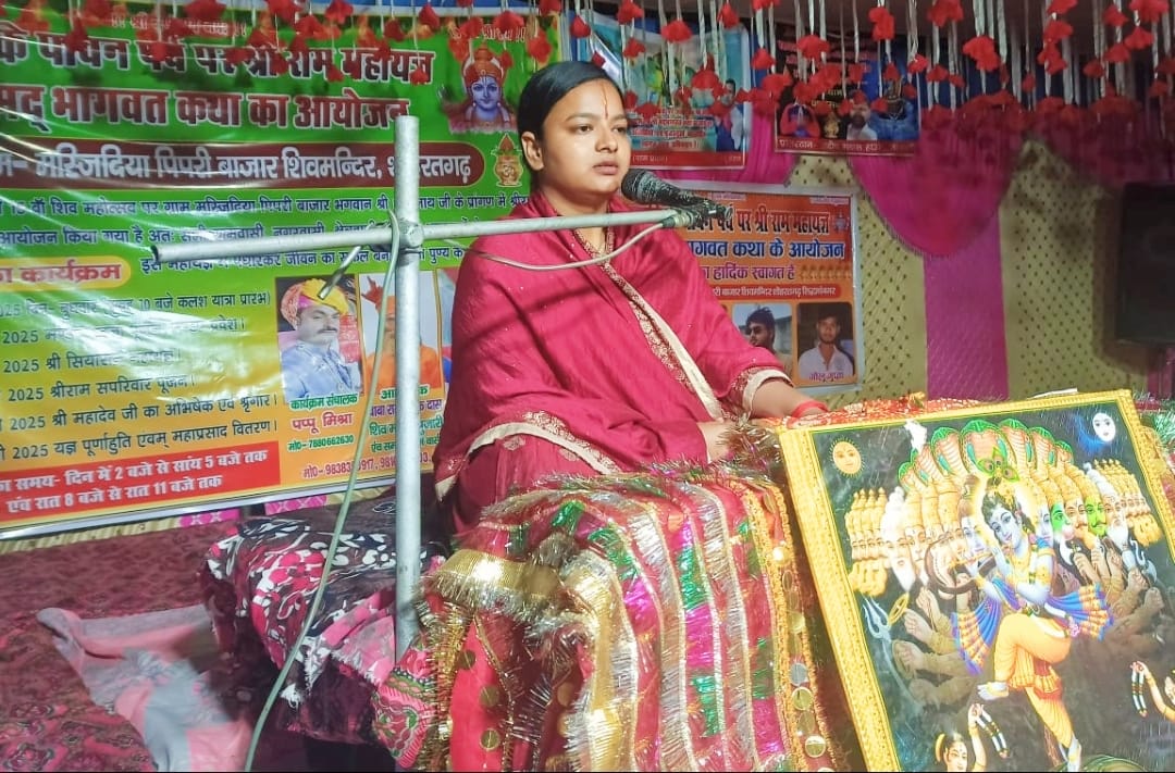 जिले के विकास खण्ड शोहरतगढ़ अन्तर्गत ग्राम पंचायत मस्जिदिया के पिपरी बाजार में शिवरात्रि के पावन पर्व श्रीराम महायज्ञ एवं श्रीमद्भागवत भागवत कथा का आयोजन किया गया। आयोजन के गुरुवार (दूसरे दिन) सुबह आचार्य राधे जी महराज ने सभी यजमान को सुर्य पूजा करके मण्डप में प्रवेश करने बाद सभी देवी देवताओं का आह्वान कर पूजा अर्चना किया। वहीं देर सायंकाल में कथा वाचिका पूज्या प्रगति पाण्डेय जी ने श्रीमद्भागवत कथा के गौकरन एवं धुंधकारी दोनों भाईयों की चरित्र के बारें बताया कि दोनों एक ही माता-पिता के पुत्र होते हुए भी दोनों का संगत के असर से दोनों लोगों में एक पूरब है, तो एक पश्चिम है। एक पूजा पाठ करके शिक्षा ग्रहण करके ज्ञानी विद्वान बनें और वहीं दूसरा गलत संगत से जुआरी शराबी व गलत ब्याबाचारी होता है। लाख गलती के बाद भी शिक्षित ज्ञानी भाई अपने भाई के गलत कार्य को सही दिशा दिखाने का राय देते हैं। वहीं धुंधकारी के मुक्ति के लिए गौकरन जी श्रीमद्भागवत कथा का सुनाने का आयोजन करने लगे। श्रीमद्भागवत कथा सुनकर आरती होते ही धुंधकारी प्रेत से मुक्ति मिलती है। कथा में दौरान श्रवण कुमार जायसवाल, भगवान दास चौहान, शेष मुनि गुप्ता, बलिराम गुप्ता, अशोक जायसवाल, सुरेन्द्र कुमार, ग्राम प्रधान शुकलावती देवी, किरन गुप्ता, मीरा देवी, सलोनी जायसवाल, कान्ति देवी सहित तमाम लोग लोग उपस्थित रहें।