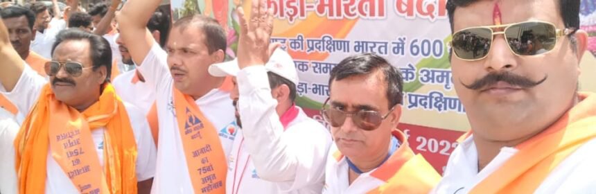 बदायूँ : स्वतंत्रता के अमृत महोत्सव के अवसर पर क्रीड़ा भारती द्वारा सम्पूर्ण राष्ट्र की अभिनव अर्चना कार्यक्रम के अन्तर्गत मोटरसाईकिल यात्रा द्वारा “राष्ट्र प्रदक्षिणा सह वंदना” का कार्यक्रम सम्पूर्ण देश में एक साथ 600 स्थानों से मोटर साइकिलों के समूहों ने कुल 18 हजार किलोमीटर की प्रदक्षिणा एक साथ शुरू की।जिले में ये यात्रा देवचरा से प्रारंभ होकर बदायूं, उझानी के रास्ते कछला पहुंचकर समाप्त हुई। बदायूं व उझानी में यात्रा का भव्य स्वागत किया गया। सर्वप्रथम भारत माता का पूजन हुआ फिर सामूहिक राष्ट्र गान का गायन हुआ।इस राष्ट्र वंदना उपक्रम की संक्षिप्त जानकारी के साथ सभी को क्रीड़ा भारती की शपथ दिलाई गई। जिले से 151 मोटरसाइकिल पर हनुमान जी की पताका लहराते हुए व गले में पट्टिका डालकर क्रीड़ा भारती के वेश में मोटरसाइकिल पर सवार होकर क्रीड़ा भारती के कार्यकर्ता व अन्य सामाजिक संगठनों के कार्यकर्ता यात्रा में शामिल हुए।