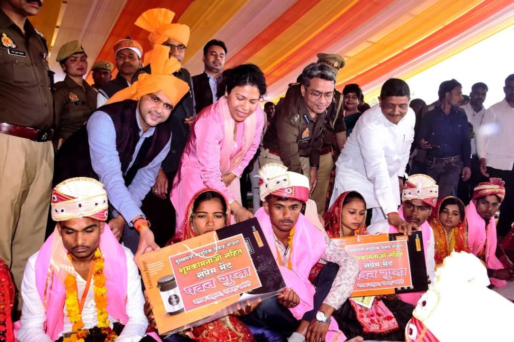 डीएम दुर्गा शक्ति नागपाल, एसपी संकल्प शर्मा, सीडीओ अभिषेक कुमार ने जनप्रतिनिधियों, अफसरो संग सभी वर-वधू से को उपहार-शगुन किट व आशीर्वाद दिया। जोड़ों के पास पहुंचकर आत्मीय संवाद करते हुए उनका परिचय पूछा, बातचीत कर नए दांपत्य जीवन की शुरूआत के लिए शुभकामना दी। नवविवाहित जोड़ों को प्रमाण पत्र के अलावा सरकार की और से दिये जाने वाला जरूरी सामान भी दिया। डीएम ने अफसरों की टीम संग प्रत्येक जोडे को दिए जाने वाले उपहार की एक-एक सामग्री का स्वयं परीक्षण किया। उपहार की गुणवत्ता ठीक पाई गई। उन्होंने वितरित किए जाने वाले भोजन की गुणवत्ता भी परखी।