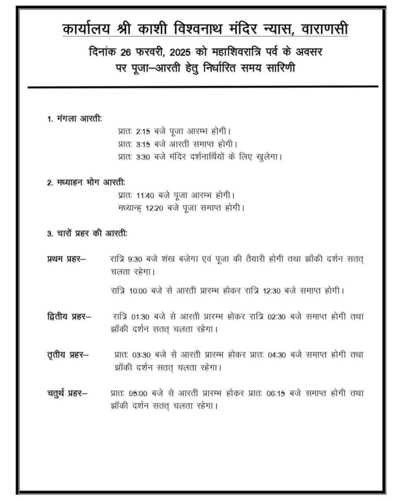 महाशिवरात्रि के विशेष अवसर पर मंदिर की आरती और पूजन व्यवस्था में बदलाव किया गया है। सप्तऋषि और शृंगार आरती इस दिन नहीं होगी। 26 फरवरी की रात आठ घंटे तक मंदिर परिसर में बाबा के विवाहोत्सव की रस्में पूरी की जाएंगी, जिसमें विशेष शृंगार और पूजन होगा। महाशिवरात्रि पर मंदिर का गर्भगृह पूरी रात खुला रहेगा, जिससे श्रद्धालु निर्बाध रूप से बाबा के दर्शन कर सकें।