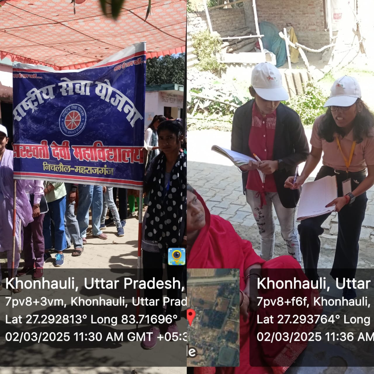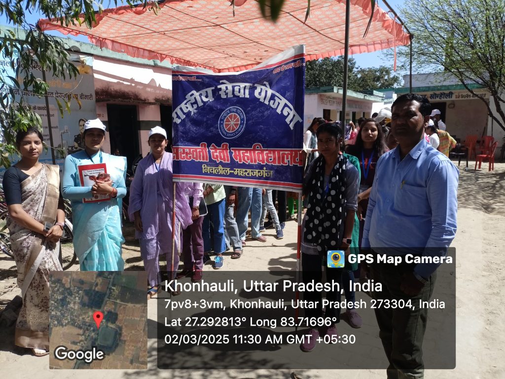 महराजगंज।जनपद के उच्च शिक्षा का सर्वश्रेष्ठ संस्थान सरस्वती देवी महाविद्यालय, निचलौल महाराजगंज के तत्वाधान में प्राथमिक विद्यालय खोन्हौली में आयोजित एनएसएस विशेष शिविर के चौथे दिन का शुभारंभ कार्यक्रम अधिकारी प्रीति तिवारी के द्वारा मां सरस्वती जी के प्रतिमा पर पुष्पार्चन से हुआ। शिविर का संचालन सत्यकाम पाण्डेय द्वारा किया गया।शिविर के तहत स्वास्थ्य जागरूकता अभियान चलाया गया, जिसमें स्वयंसेवकों ने टोलियों में बंटकर घर-घर जाकर सर्वेक्षण और जागरूकता कार्य किया। स्थानीय लोगों को स्वास्थ्य, स्वच्छता और पोषण के प्रति जागरूक किया गया।
