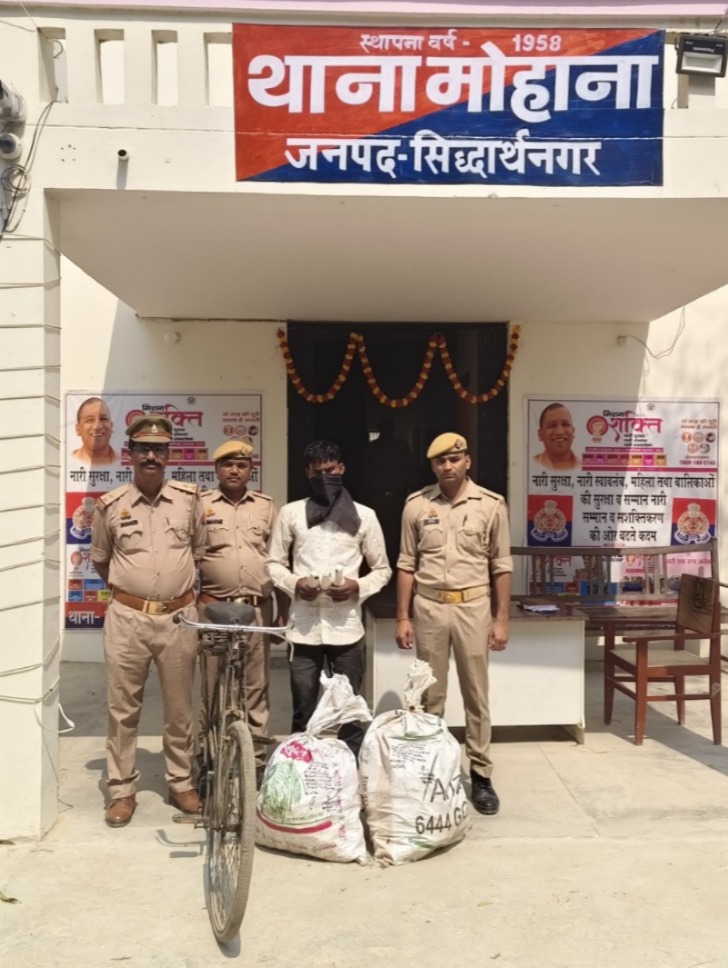 डॉ0 अभिषेक महाजन, पुलिस अधीक्षक सिद्धार्थनगर के आदेश पर एवं सिद्धार्थ, अपर पुलिस अधीक्षक सिद्धार्थनगर के निर्देशन में व अरूणकान्त सिंह, क्षेत्राधिकारी सदर, के कुशल पर्यवेक्षण में अनूप कुमार मिश्र थानाध्यक्ष मोहाना सिद्धार्थनगर के कुशल नेतृत्व मे आज दिनांक 11.03.2025 को अपराध एवं अपराधियों व अवैध मदिरा की तस्करी, विक्रय व निष्कर्षण के विरुद्ध चलाये जा रहे अभियान तथा आगामी त्यौहारों के दृष्टिगत इण्डो नेपाल बार्डर पिलर संख्या 544 से 100 मीटर पहले वहद ग्राम ककरहवा बाग से एक अभियुक्त को 179 शीशी विभिन्न ब्राण्ड के नेपाली अवैध मदिरा लगभग 53.7 लीटर व घटना में प्रयुक्त एक अदद साइकिल के साथ गिरफ्तार किया गया । बरामदगी व गिरफ्तारी के आधार पर थाना स्थानीय पर मु0अ0सं0 43/2025 धारा 63/72 आबकारी अधिनियम पंजीकृत कर अभियुक्त को माननीय न्यायालय भेजा जा रहा है ।