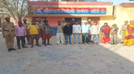लखीमपुर खीरी, 16 MARCH 2025। पुलिस अधीक्षक खीरी, संकल्प शर्मा के निर्देशन व अपर पुलिस अधीक्षक खीरी के निकट पर्यवेक्षण में सम्पूर्ण जनपद में अपराध की रोकथाम व वांछित/वारंटी अभियुक्तों की गिरफ्तारी हेतु चलाए जा रहे अभियान के अंतर्गत क्षेत्राधिकारी मितौली के कुशल मार्गदर्शन में आज दिनांक 16.03.2025 को थाना मितौली पुलिस टीम द्वारा शान्ति भंग करने वाले 11 नफर अभियुक्तो 1.नैमिष पुत्र रमेश उम्र 23 वर्ष निवासी लल्हौआ थाना मितौली खीरी 2. जितेन्द्र कुमार त्रिवेदी उर्फ गबडू पुत्र छोटेलाल त्रिवेदी उम्र 32 वर्ष निवासी ग्राम दतेली कलां थाना मितौली खीरी 3. संतोष कुमार पुत्र मनोहर लाल उम्र 45 वर्ष 4. मुकेश कुमार पुत्र मनोहर लाल उम्र 40 वर्ष 5. बृजेश कुमार पुत्र मनोहर लाल उम्र 32 वर्ष 6. ममता पत्नी संतोष कुमार उम्र 35 वर्ष निवासीगण कस्ता थाना मितौली खीरी 7. राजू पुत्र रमेश उम्र 45 वर्ष 8. सुधाकर पुत्र राजू उम्र 20 वर्ष 9. प्रदीप पुत्र राजू उम्र 22 वर्ष 10. राजरानी पत्नी राजू उम्र 42 वर्ष 11. मरा पत्नी बृजेश उम्र 25 वर्ष निवासीगण बेगमापुर थाना महोली जिला सीतापुर को गिरफ्तार कर अतंर्गत धारा 170/126/135 बीएनएसएस में विधिक कार्यवाही हेतु मा0 न्यायालय के समक्ष भेजा गया।