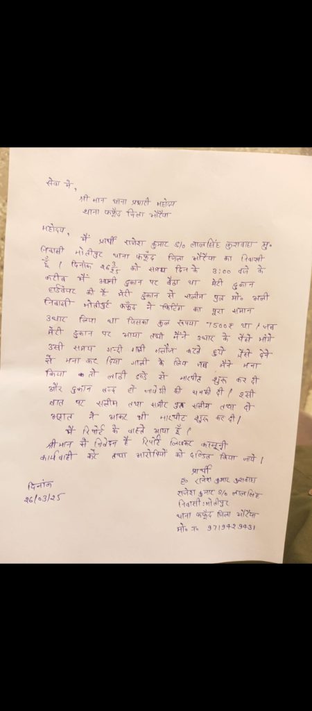 औरैया – प्रार्थी राजेश कुमार पुत्र लाल सिंह कुशवाह निवासी मोतीपुर ने पुलिस को दिए शिकायती पत्र में बताया है कि दिन बुधवार को समय 3:00 बजे में अपनी दुकान पर बैठा था। मेरी दुकान हार्डवेयर की है मेरी दुकान से सलीम पुत्र मोहम्मद अली निवासी उपरोक्त फिटिंग का पूरा समान 7000 में उधार लिया था। जब विपक्षी दुकान पर आया तो मैं अपने उधर दिए सामान के पैसे मांगे तो । विपक्षी ने नहीं देने की बात कही। तो प्रार्थी ने कहा क्यों नहीं मेरे पैसे दोगे तो विपक्षी ने दुकान बंद करवा देने व जान से मारने की धमकी दे डाली। जब प्रार्थी ने इसका विरोध किया तो विपक्षी के सलीम, समीर ने आकर प्रार्थी के साथ लाठी डंडों से मारपीट कर दी। प्रार्थी ने कोतवाली फफूंद में शिकायत देकर उपरोक्त विपक्षियों के खिलाफ कार्रवाई की मांग की है।