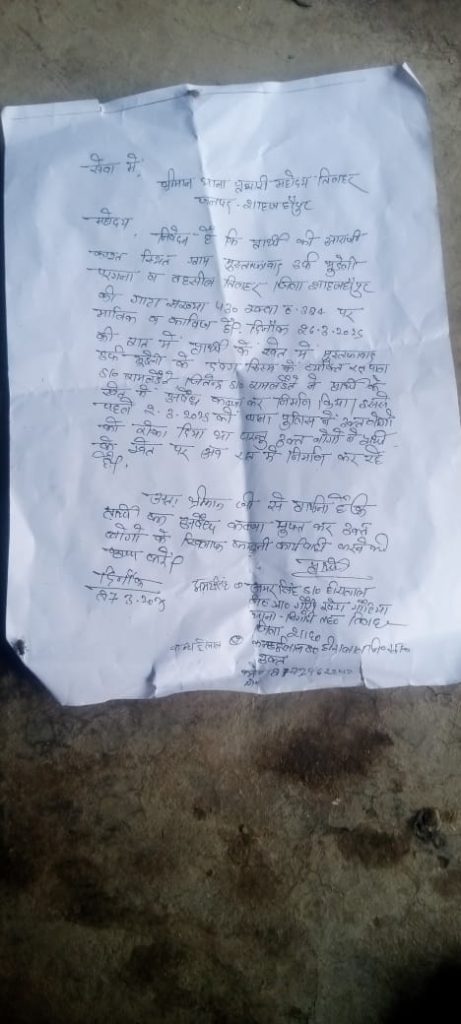 तिलहर थाना क्षेत्र के ग्राम मुस्तफाबाद उर्फ भुडेली में खेत स्थित गाटा संख्या 430 पर गांव के ही जितेंद्र पुत्र रामलडेते रछपाल पुत्र रामलडेते दबंग किशम के लोग हैं अवैध रूप से कब्जा कर पक्का मकान बनाने के लिए निर्माण शुरू कर दिया हैं अमर सिंह ने कहा मेरे खेत में दीवार क्यों उठा रहे हो इतने में दबंग आग बबूला हो गए गाली गलौज करते हुए अमर सिंह को वहां से भगा दिया जान से मारने की दी धमकी प्रार्थी ने थाना तिलहर पर दिया शिकायती पत्र तिलहर पुलिस ने मौके पर जाकर निर्माण रुकवा दिया था दबंगों ने निर्माण फिर शुरू कर दिया साथ ही जमीन पर अवैध रूप से कब्जा कर लिया गया है जिसकी शिकायत उच्च अधिकारियों से भी की है
