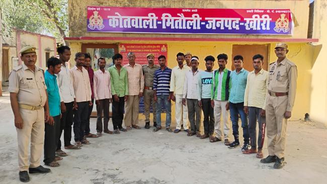 लखीमपुर खीरी। पुलिस अधीक्षक खीरी संकल्प शर्मा के निर्देशन में सम्पूर्ण जनपद में अपराध एवं अपराधियों के विरुद्ध चलाये जा रहे अभियान के अंतर्गत अपर पुलिस अधीक्षक खीरी के संनिकट पर्यवेक्षण व क्षेत्राधिकारी मितौली के कुशल मार्ग दर्शन तथा प्रभारी निरीक्षक थाना मितौली शिवा जी दूबे के नेतृत्व में थाना मितौली खीरी की पुलिस टीम द्वारा दिनांक 24.04.2025 को शान्ति भंग करने वाले 14 नफर अभियुक्त 1. रमाकान्त पुत्र सियाराम उम्र 40 वर्ष 2. रोहित पुत्र सियाराम उम्र 23 वर्ष निवासीगण ग्राम कचियानीपुरवा थाना मितौली खीरी 3.सोने लाल पुत्र परागीलाल उम्र 36 वर्ष निवासी ग्राम कचियानी थाना मितौली जनपद खीरी 4. इब्राहिम पुत्र लहूर मोहम्मद उम्र 29 वर्ष निवासी ग्राम मुल्तानपुर ग्रन्ट थाना मितौली जनपद खीरी 5. रामलखन पुत्र हरद्वारी लाल उम्र 46 वर्ष 6. कमलेश कुमार पुत्र शिवरतन लाल उम्र 45 वर्ष 7. शिवान्शू पुत्र छत्रपाल उम्र 27 वर्ष निवासीगण ग्राम चन्दपुरवा थाना मितौली जनपद खीरी 8. अशोक कुमार पुत्र मोहन लाल उम्र 40 वर्ष 9. राजेन्द्र प्रसाद पुत्र गंगाराम उम्र 50 वर्ष 10. सर्वेश कुमार पुत्र राजेन्द्र प्रसाद उम्र 28 वर्ष निवासीगण ग्राम मूसेपुर थाना मितौली जनपद खीरी 11. चन्द्रिका पुत्र रामासरे उम्र 45 वर्ष 12. अवधेश पुत्र रामासरे उम्र 30 वर्ष 13. रामाकान्त पुत्र रामासरे उम्र 39 वर्ष 14. रवी कुमार पुत्र चन्द्रिका उम्र 20 वर्ष निवासीगण ग्राम अमानतपुर थाना मितौली जनपद खीरी को गिरफ्तार कर अतंर्गत धारा 170/126/135 बीएनएसएस में विधिक कार्यवाही हेतु मा0 न्यायालय के समक्ष भेजा गया।