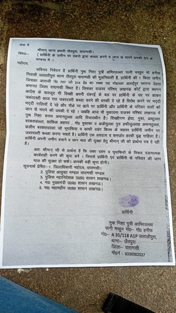 बनारस से सुभान अली आज वाराणसी के जैतपुरा थाना अंतर्गत सिंघवाघाट में ज़मीनी विवाद का मामले सामने आया है जिसमें सईदा फातमा के आरोप है कि मृतक सिद्दीकुल्ला की 35 बिस्सा जमीन जो कि सिंघवा घाट में है जिसका मामला लखनऊ में न्यायपालिका में विचाराधीन इस जमीन पर न्यायपालिका ने स्टे लगा दिया है सईदा फातिमा ने बताया कि सिद्दीकुल्ला जिनके दो पुत्र थे वलीउल्ला और अमानतुल्ला वलीउल्ला के दो पुत्र थे वलीउल्ला अमानतुल्ला और अमीरउल्ला की एक पुत्री थी जिसका नाम नूरुन निशा हफीजुल्ला और वालीउल्लाह का कहना है कि नूरुल निशा अम्रुल्लाह की बेटी नहीं है हफीजुल्लाह और वालीउल्लाह बार बार जमीन पर कब्जा कर रहे हैं और अपने पैसे के बल पर प्रशासन का साथ लेकर स्टे लगी जमीन पर बार-बार अपना कार्य करवाने की कोशिश कर रहे हैं और सईदा फातिमा से गाली गलौज कर रहे हैं। बनारस से सुभान अली
