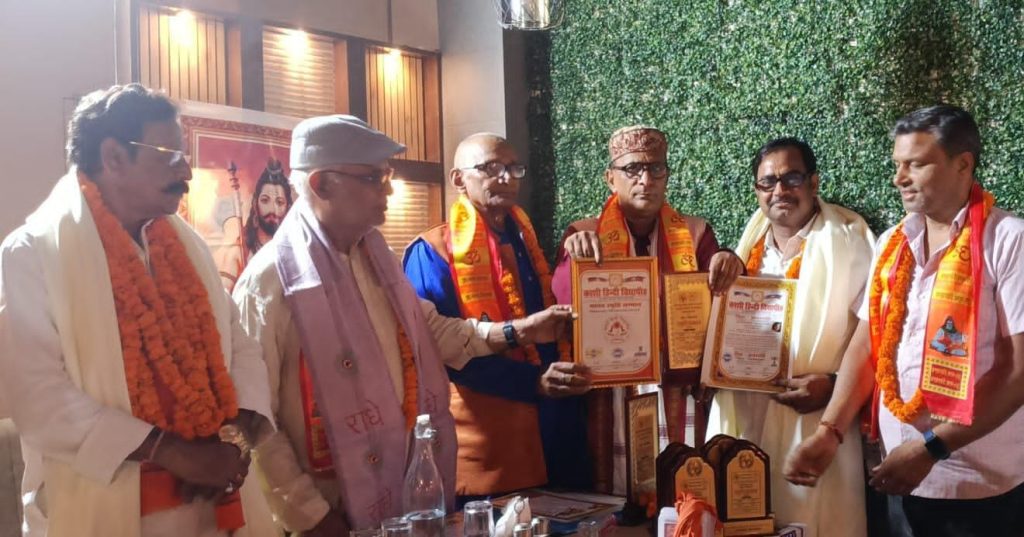 बनारस से सुभान अली की रिपोर्ट *. वाराणसी महानगर के तेलियाबाग अथर्व फेमिली सभागार में काशी हिन्दी विद्यापीठ के कुलसचिव एवं अखिल भारतीय लेखक कवि कलाकार परिषद् के संस्थापक कवि इन्द्रजीत तिवारी निर्भीक एवं आर्या पब्लिकेशन लखनऊ के प्रधान संपादक सौरभ पाण्डेय के प्रमुख संयोजन/संचालन में भगवान् श्री परशुराम स्मृति काव्य महाकुंभ एवं सम्मान समारोह का आयोजन कुलाधिपति कवि सुखमंगल सिंह मंगल एवं नादान परिंदे साहित्य मंच के राष्ट्रीय अध्यक्ष डॉ. सुबाष चन्द्र ने भगवान् श्री परशुराम को माल्यार्पण कर किया। वाणी वन्दना एवं स्वागत गान इंद्रजीत तिवारी निर्भीक एवं सिद्धनाथ शर्मा सिद्ध ने संयुक्त रूप से किया। उक्त अवसर पर विभिन्न क्षेत्रों से जुड़े लोगों को काशी हिन्दी विद्यापीठ द्वारा विद्या -वाचस्पति विशेष मानद सम्मान एवं भगवान् श्री परशुराम स्मृति सम्मान भी कुलाधिपति कवि सुखमंगल सिंह मंगल एवं उप कुलपति डॉ. महेन्द्र तिवारी अलंकार ने भेंट किया।