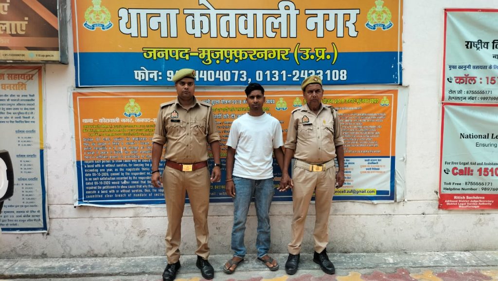 मुजफ्फरनगर।वरिष्ठ पुलिस अधीक्षक के निर्देशन मे व प्रभारी निरीक्षक श्री उमेश रोरिया के नेतृत्व में जनपद मे वांछित /ईनामी अभियुक्त के विरूद्ध चलाये जा रहे अभियान के दौरान आज मुखबिर खास की सूचना पर चुंगी नं0 02 के पास से वाँछित/ईनामी अभियुक्त मिथुन उर्फ नीरज पुत्र महावीर सिंह निवासी मौहल्ला धनधन पट्टी कस्बा व थाना छपरौली जनपद बागपत को थाना कोतवाली नगर मुजफ्फरनगर ने 15,000 रूपये ईनामी अपराधी को गिरफ्तार किया है। थाना कोतवाली नगर द्वारा अग्रिम विधिक कार्यवाही कर अभियुक्त को जेल भेजा जा रहा है।R