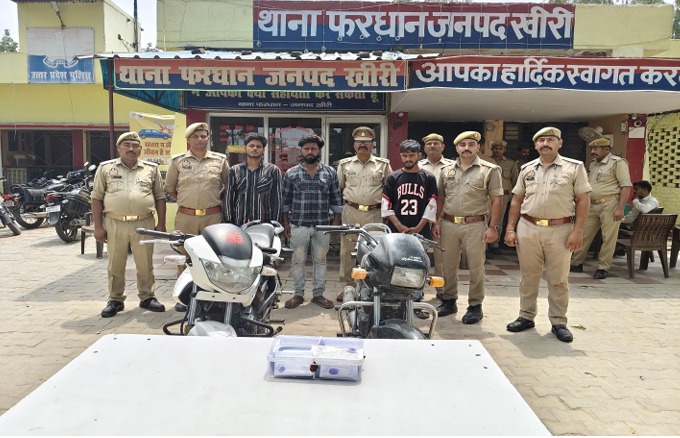 फरधान खीरी।एसपी संकल्प शर्मा के निर्देशन में सम्पूर्ण जनपद में अपराध की रोकथाम व वांछित/वारंटी अभियुक्तों की गिरफ्तारी हेतु चलाए जा रहे अभियान के अंतर्गत क्षेत्राधिकारी रमेश कुमार तिवारी के कुशल मार्गदर्शन में दिनांक 08.05.2025 को थाना फरधान पुलिस टीम द्वारा, दिनांक 30.04.2025 को घटित लूट की घटना का सफल अनावरण करते हुए 03 नफर शातिर व्यक्तियों को गिरफ्तार किया। जिनके कब्जे से लूट का सामान, नगदी तथा घटना में प्रयुक्त मोटरसाइकिल बरामद किया गया।वादी मुकदमा नवल किशोर सोनी पुत्र राम बिलास सोनी निवासी मो0 मोतीपुर थाना कोतवाली सदर खीरी अपनी ज्वैलरी की दुकान स्थित ग्राम कैमहरा को बन्द करके शांय करीब 18.40 बजे घर को जा रहे थे कि रास्ते में रुकुन्दीपुर गन्ना सेन्टर के पास कुछ अज्ञात लोगों के द्वारा उनके साथ लूट की घटना कारित की गयी तथा चोटें पहुंचाई गयी। जिसके सम्बन्ध में थाना फरधान पर दिनांकः 01.05.2025 को मु0अ0सं0 161/2025 धारा 309(6) बीएनएस बनाम अज्ञात व्यक्तियों के विरुद्ध पंजीकृत कराया गया था। जिसमें दिनांक 08.05.2025 को उक्त घटना का खुलासा करते हुये फरधान की पुलिस द्वारा चेकिंग/गस्त के दौरान उक्त घटना में संलिप्त व्यक्ति सुधीर कश्यप उर्फ मामा पुत्र कल्लू कश्यप नि०मो0 अर्जुन पुरवा उम्र करीब-26 वर्ष , राशिद पुत्र मो० उमर निवासी छाउछ थाना कोतवाली सदर उम्र करीब 20 वर्ष व 3.अब्दुल हुसेन पुत्र फरीद निवासी ग्राम विनौरा थाना पढुवा जिला खीरी उम्र करीब 21 वर्ष को नहर पुलिया सड़क पर ग्राम कंचनपुर थाना फरधान जनपद खीरी से गिरफ्तार किया। गिरफ्तार व्यक्ति के कब्जे से घटना में प्रयुक्त 02 अदद मोटर साइकिल व घटना से सम्बन्धित एक अदद काला बैग, चाभी का गुच्छा, नगद 9600 रूपया बरामद किया गया व घटना में संलिप्त व्यक्ति बजरंगी पुत्र आनन्द किशोर मिश्रा नि0 मो0 काशीराम कालोनी लालपुर थाना कोतवाली सदर ,गामा पुत्र छोटन्ने नि०ग्रा० बिनौरा थाना , जुबेर पुत्र मल्हर निवासी ग्राम बिनौरा थाना- पढुवा, जनपद- खीरी मौके से अंधेरे का फायदा उठाकर भागने में सफल रहे। जिनकी तलाश हेतु टीम गठित कर गिरफ्तारी के प्रयास किये जा रहे थे। व्यक्तियों की गिरफ्तारी व बरामदगी के आधार पर मुकदमा उपरोक्त को धारा 309 (6) BNS से धारा 310 (2)/311/317(3) BNS में तरमीम किया गया है। गिरफ्तार व्यक्ति के विरूद्ध विधिक कार्यवाही की जा रही है।