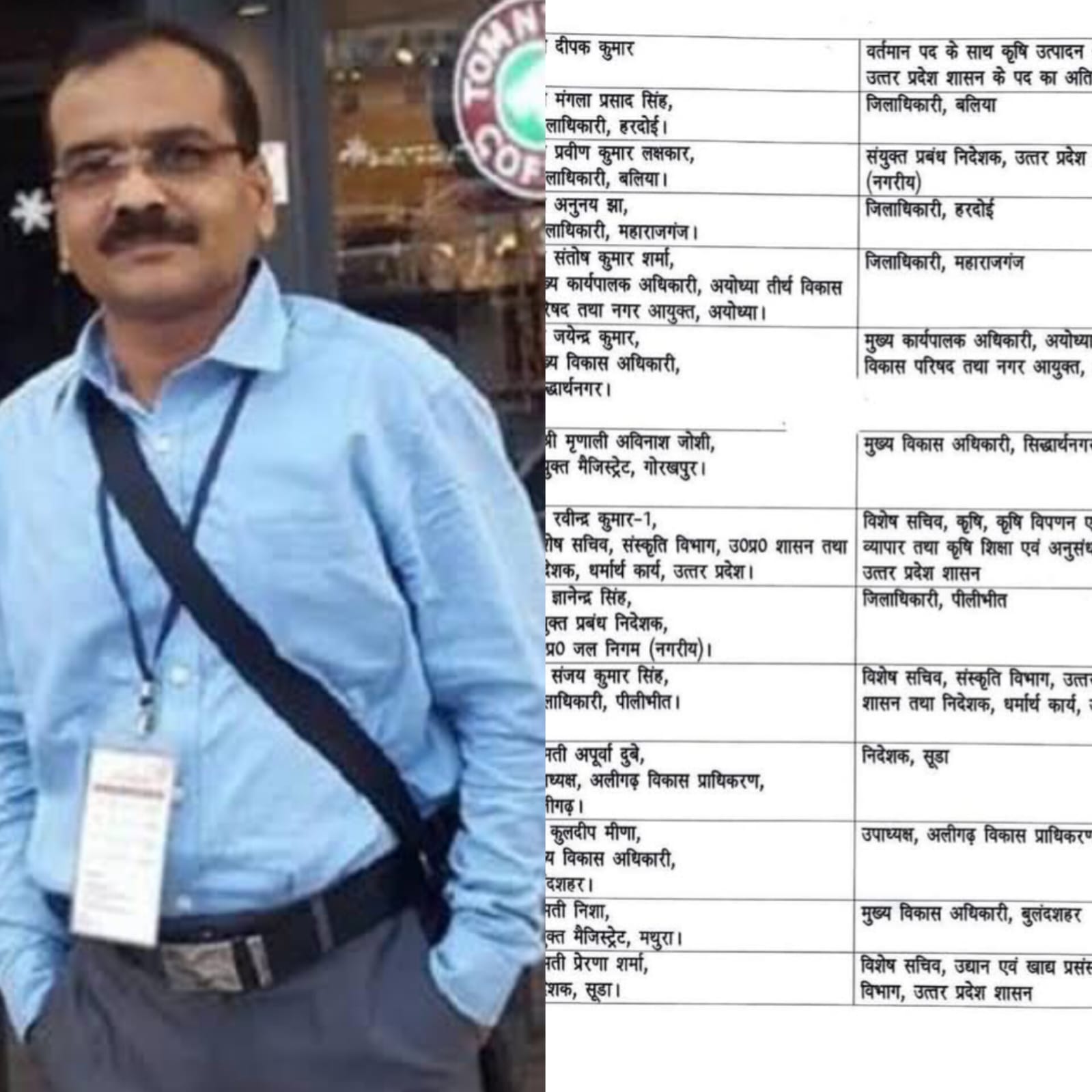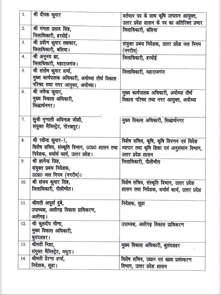 वहीं, सुश्री मृणाली अविनाश जोशी को संयुक्त मैजिस्ट्रेट गोरखपुर के पद से मुख्य विकास अधिकारी सिद्धार्थनगर के पद पर भेजा गया है। रवीन्द्र कुमार-1 को विशेष सचिव संस्कृति विभाग और निदेशक धर्मार्थ कार्य से अब विशेष सचिव कृषि, कृषि विपणन एवं विदेश व्यापार और कृषि शिक्षा एवं अनुसंधान विभाग भेजा गया है। संयुक्त प्रबंध निदेशक, उप्र जल निगम (नगरीय) ज्ञानेन्द्र सिंह को पीलीभीत का जिलाधिकारी बनाया गया है। पीलीभीत में जिलाधिकारी संजय कुमार सिंह को अब विशेष सचिव, संस्कृति विभाग और निदेशक धर्मार्थ कार्य होंगे।अलीगढ़ विकास प्राधिकरण की उपाध्यक्ष श्रीमती अपूर्वा दुबे को सूडा का निदेशक बनाया गया है। अपूर्वा दुबे की जगह कुलदीप मीणा अलीगढ़ विकास प्राधिकरण के उपाध्यक्ष होंगे। कुलदीप मीणा के पास इस समय बुलंदशहर के मुख्य विकास अधिकारी की जिम्मेदारी है। अब बुलंदशहर के मुख्य विकास अधिकारी की जिम्मेदारी मथुरा की संयुक्त मजिस्ट्रेट श्रीमति निशा संभालेंगी। इसके अलावा सूडा की निदेशक श्रीमती प्रेरणा शर्मा को विशेष सचिव, उद्यान एवं खाद्य प्रसंस्करण विभाग भेजा गया है।