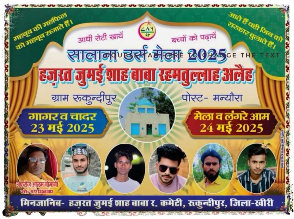 * – शाबान सिद्दीकी*फरधान खीरी। थाना क्षेत्र में आगामी 23 व 24 मई को जुमाई पीर बाबा की दरगाह पर मेले का आयोजन होना निश्चित हुआ है। फरधान थाना क्षेत्र के रूकुन्दीपुर के स्थल पर आयोजित होने वाले जुमाई पीर बाबा के मेले में दूर दूर से सभी समाज के लोग मेला देखने आते हैं। जिसमें 23 को गागर व चादर पोसी की जाएगी। इन्हें माशा वाले बाबा के नाम से भी जाना जाता है, यहां सभी की मांगी हुई मुरादें भी पूरी होती हैं।मेले में नौटंकी का प्रोग्राम रखा गया है, और दूर दराज से आए हुए मेहमानों के खाने के लिए लंगर जारी व्यवस्था की जाएगी। ईस मेले में हर प्रकार की दुकानें लगती हैं, और पुलिस प्रशासन की भी चाक चौबंद व्यवस्था रहती है। मेला की व्यवस्था के लिए मुख्य रूप से ग्राम प्रधान ब्रजेश कुमार वर्मा, मेला कमेटी के सदर रियाजुद्दीन अंसारी, खजांची साबिर अली, अफरोज आलम, सब्बीर अहमद, सरफराज अंसारी, आदि ग्रामीण लोग उपस्थित रहते है।