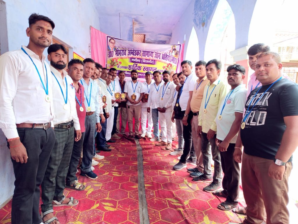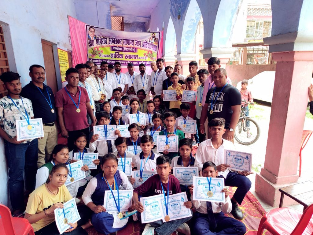 नगर नगीना में डॉक्टर भीमराव अंबेडकर सामान्य ज्ञान प्रतियोगिता का आयोजन किया गया।नगीना।नगर नगीना में डॉक्टर भीमराव अंबेडकर सामान्य ज्ञान प्रतियोगिता का आयोजन किया गया जोकि M.M इंटर कॉलेज में आयोजित की गई। सामान्य ज्ञान प्रतियोगिता में बहुजन समाज से संबंधित महापुरुषों के बारे में प्रश्न पूछे गए जैसे डॉक्टर भीमराव अंबेडकर, महात्मा ज्योतिबा फुले, सावित्रीबाई फुले, संतों में संत रहे संत शिरोमणि गुरु रविदास जैसे महापुरुषों के जीवन संबंध से प्रश्न पूछे गए। इस प्रतियोगिता में बहुजन समाज के 128 विद्यार्थी सम्मिलित रहे जिसमें बालक वर्ग में 56 और बालिका वर्ग में 72 विद्यार्थी सम्मिलित रहे। प्रतियोगिता का आयोजन दो वर्गों में किया गया जूनियर वर्ग और सीनियर वर्ग । वहीं सीनियर वर्ग में प्रथम स्थान दिव्यांशु सैनी द्वितीय स्थान मयंक कुमार और तृतीय स्थान निर्भय कुमार ने प्राप्त किया वहीं जूनियर वर्ग में प्रथम स्थान शशांक कुमार द्वितीय स्थान माही वर्धन वही तृतीय स्थान सक्षम कुमार ने प्राप्त किया । इसी प्रतियोगिता में SC/ST/OBC वर्ग के 70% इंटरमीडिएट तथा हाई स्कूल पास बच्चों को भी सम्मानित किया गया उसी के साथ बहुजन समाज के जिन बच्चों ने राज्य स्तर मंडल स्तर तथा जिला स्तर खेल प्रतियोगिता में स्थान प्राप्त किया है।उन विद्यार्थियों को भी सम्मानित किया गया। वही कार्यक्रम के मुख्य अतिथि R.S.M महा विश्वविद्यालय के प्रोफेसर रामकुमार रहे। वहीं मुख्य अतिथि ने कहा कि आज बहुजन समाज के लिए बड़े हर्ष की बात है कि बहुजन समाज में महापुरुषों के बारे में यह प्रतियोगिता नगर नगीना में पहली बार कराई जा रही है जिसमें सभी विद्यार्थियों ने बढ़ चढ़कर भाग लिया मैं उनका धन्यवाद करना चाहता हूं साथ ही इस प्रतियोगिता के माध्यम से उन विद्यार्थियों को बहुजन समाज में जन्मे महापुरुषों के जीवन के बारे में जानकारी प्राप्त होगी। महापुरुषों का जीवन परिचय विद्यार्थियों को जीवन के लिए प्रेरणादायक होगा।वही कार्यक्रम के विशिष्ट अतिथि पूर्व CO श्री हरीराम निमला, श्री दिनेश सैनी रहे।कार्यक्रम के अध्यक्ष श्री राजकुमार (पूर्व अध्यक्ष संत शिरोमणि गुरु रविदास महासभा), आयोजन श्री धर्मेंद्र कुमार, ज्ञान सिंह (आजाद समाज पार्टी), जिला उपाध्यक्ष आजाद समाज पार्टी के विपिन गुठलियों, अंबेडकर स्मारक समिति के अध्यक्ष श्री समगचंद प्रधान, अवनीश कुमार, जितेंद्र कुमार, वीर सिंह, पूर्व नगर पालिका बाबू मदनपाल सिंह, अतुल भारती, प्रमोद कुमार ,संजय कुमार , बहुजन समाज पार्टी के विधानसभा प्रभारी रविकुमार ,सुंदर संचालन रविकांत द्वारा किया गया। और समाज के गणमान्य व्यक्ति सम्मिलित रहे।