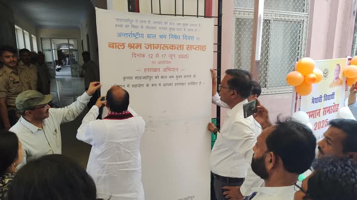 **हस्ताक्षर अभियान के द्वारा लिया संकल्प: जनपद को बनाना है बाल श्रम मुक्त**शाहजहाँपुर। अन्तर्राष्ट्रीय बाल श्रम निषेध दिवस के अवसर पर जनपद में बाल श्रम जागरूकता सप्ताह 12 से 17 जून का शुभारंभ एक जन-जागरूकता हस्ताक्षर अभियान के माध्यम से किया गया। इस अभियान का उद्देश्य जनपद को बाल श्रम से मुक्त करना और बच्चों को शिक्षा की मुख्यधारा से जोड़ना है।संकल्प लिया गया शाहजहाँपुर ने ठाना है, जनपद को बाल श्रम मुक्त बनाना है। बच्चों को शिक्षा से जोड़कर, उनको मुख्य धारा में लाना है। इस अवसर पर आयोजित हस्ताक्षर अभियान में जनपद के गणमान्य जनप्रतिनिधियों, प्रशासनिक अधिकारियों, शिक्षकों, छात्र-छात्राओं और आम नागरिकों ने बढ़-चढ़कर भाग लिया और बाल श्रम के खिलाफ एकजुट होकर संकल्प लिया। कार्यक्रम में सांसद अरुण कुमार सागर, जिला पंचायत अध्यक्ष ममता यादव, विधायक जलालाबाद हरि प्रकाश वर्मा, विधायक ददरौल अरविंद कुमार सिंह, जिलाधिकारी धर्मेंद्र प्रताप सिंह, नगर आयुक्त डॉ. विपिन कुमार मिश्र, मुख्य विकास अधिकारी डॉ. अपराजिता सिंह, जिला विद्यालय निरीक्षक हरिवंश कुमार, सहायक श्रम आयुक्त नासिर खान सहित अन्य जनप्रतिनिधि, अधिकारीगण तथा शिक्षण संस्थानों के प्रतिनिधियों ने भी हस्ताक्षर कर अपना समर्थन प्रदान किया। इस अभियान के माध्यम से जनपदवासियों से आह्वान किया गया कि वे बाल श्रम के उन्मूलन में अपनी नैतिक जिम्मेदारी निभाएं तथा हर बच्चे को शिक्षा का अधिकार दिलाने में प्रशासन का सहयोग करें।