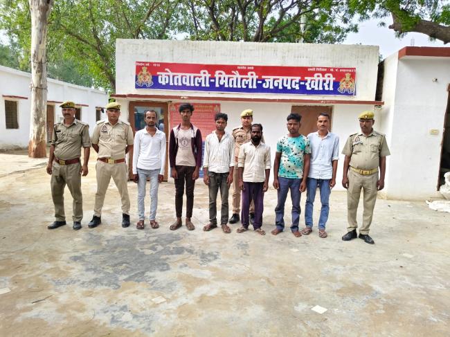 लखीमपुर खीरी, 22 जून:* पुलिस अधीक्षक खीरी संकल्प शर्मा के निर्देशन में सम्पूर्ण जनपद में अपराध एवं अपराधियों के विरुद्ध चलाये जा रहे अभियान के अंतर्गत अपर पुलिस अधीक्षक खीरी के संनिकट पर्यवेक्षण व क्षेत्राधिकारी मितौली के कुशल मार्ग दर्शन तथा प्रभारी निरीक्षक थाना मितौली शिवा जी दुबे के नेतृत्व में थाना मितौली खीरी की पुलिस टीम द्वारा दिनांक 22.06.2025 को शान्ति भंग करने वाले 02 नफर अभियुक्त 1. दीपक पुत्र स्व0 सर्वेश कुमार 2. प्रशान्त कुमार पुत्र स्व0 सर्वेश कुमार सर्व निवासीगण ग्राम पिपरझला थाना मितौली खीरी 3. आशीष कुमार पुत्र रामऔतार निवासी ग्राम डोकरपुर थाना मितौली खीरी 4. राजू पुत्र रोहन लाल निवासी ग्राम अकबरपुर थाना मितौली खीरी 5. नागेश्वर पुत्र विश्राम निवासी ग्राम गोदियापुरवा थाना मितौली खीरी 6. सुनील पुत्र छोटकई निवासी ग्राम चतुरैया थाना मितौली खीरी को अन्तर्गत धारा 170/126/135 बीएनएसएस मे गिरफ्तार कर विधिक कार्यवाही हेतु मा0 न्यायालय के समक्ष भेजा गया ।नाम पता गिरफ्तार अभियुक्तः-1. दीपक पुत्र स्व0 सर्वेश कुमार उम्र 32 वर्ष निवासी ग्राम पिपरझला थाना मितौली खीरी2. प्रशान्त कुमार पुत्र स्व0 सर्वेश कुमार उम्र 26 वर्ष निवासी ग्राम पिपरझला थाना मितौली खीरी3. आशीष कुमार पुत्र रामऔतार उम्र 32 वर्ष निवासी ग्राम डोकरपुर थाना मितौली खीरी4.राजू पुत्र रोहन लाल उम्र 35 वर्ष निवासी ग्राम अकबरपुर थाना मितौली खीरी5.नागेश्वर पुत्र विश्राम उम्र 23 वर्ष निवासी ग्राम गोदियापुरवा थाना मितौली खीरी6. सुनील पुत्र छोटकई उम्र 18 वर्ष निवासी ग्राम चतुरैया थाना मितौली खीरीगिरफ्तारी करने वाली पुलिस टीम का विवरणः-1.उ0नि0 मनोज कुमार थाना मितौली जनपद खीरी2. उ0नि0 बलबीर सिंह थाना मितौली जनपद खीरी3. हे0का0 सन्तराम थाना मितौली जनपद खीरी4. का0 चमन सिंह थाना मितौली जनपद खीरी5. का0 राजीव सिंह थाना मितौली जनपद खीरी6. का0 लवकुश गुप्ता थाना मितौली खीरी।