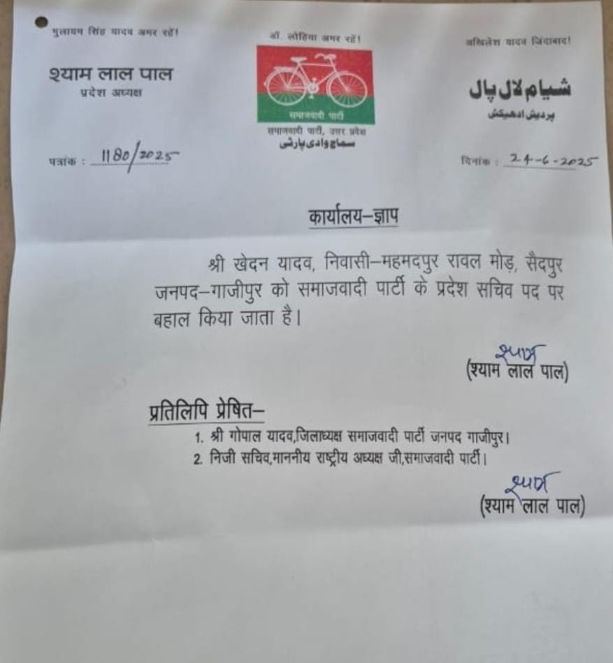सैदपुर : सपा प्रदेश अध्यक्ष ने पत्र जारी कर बहाल किया जिपं सदस्य खेदन सिंह यादव का प्रदेश सचिव का पद, विरोधियों को लेकर कही ये बातब्यूरो चीफ गाजीपुर संवाददाता विशाल सिंह सैदपुर सैदपुर। बीते दिनों प्रेस वार्ता कर जिला संगठन, सैदपुर के सपा विधायक सहित उनके पिता पर कई आरोप लगाने वाले जिला पंचायत सदस्य खेदन सिंह यादव को समाजवादी पार्टी ने उनके प्रदेश सचिव के पद पर बहाल कर दिया है। उन्होंने पार्टी के इस निर्णय का स्वागत किया है। बता दें कि बीते दिनों खेदन सिंह यादव को सपा द्वारा पद से हटाने का पत्र जारी किया गया था। खेदन सिंह यादव का एक विवाद का मामला था। जिसमें उन्होंने अपने खिलाफ पैरवी का आरोप लगाया था। साथ ही सपा जिला संगठन, विधायक अंकित भारती व उनके पिता पर तमाम आरोप लगाया था। यहां तक कह दिया था कि उनके द्वारा सपा कार्यकर्ताओं पर ही एससीएसटी एक्ट का मुकदमा दर्ज करा दिया गया है। उनके प्रेस वार्ता के बाद सपा के कार्यकारिणी सदस्य अरविंद सिंह के लेटर पैड का एक पत्र सार्वजनिक हुआ, जिसमें उन्होंने खेदन सिंह यादव को पदमुक्त कर दिया था। ऐसे में खेदन सिंह यादव के प्रेस वार्ता के बाद जमकर होहल्ला मचा था। लेकिन अब 5 दिनों के बाद सपा के प्रदेश अध्यक्ष श्यामलाल पाल ने पत्र जारी कर खेदन यादव का पद बहाल करते हुए उन्हें पुनः प्रदेश सचिव बनाया है। इस बाबत खेदन सिंह यादव ने कहा कि पार्टी मुखिया से कुछ विरोधी लोगों ने गलत शिकायत की थी, लेकिन अब पार्टी के सामने सब कुछ स्पष्ट हो गया है तो पुनः पद बहाल कर दिया गया है। खेदन ने कहा कि विरोधियों के मुंह पर अब ताला लग गया है।