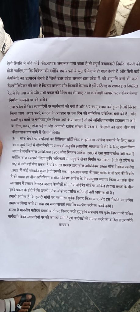 ब्रेकिंग न्यूज़ बदायूँ रिपोर्टरप्रदीप पाण्डेय बदायूं जनपद बदायूं तहसील दातागंज के खाद बीज विक्रेताओ मे कृषि विभाग के प्रति आक्रोश।कृषि विभाग द्वारा दुकानदारों को प्रताड़ित करने का दुकानदारों ने लगाया आरोप। खाद बीज कंपनियों द्वारा ओवर रेटिंग बिक्री को लेकर दुकानदार परेशान।दुकानदारों ने कहा कि हमारी समस्या का समाधान नहीं हुआ तो हम लोग धरना प्रदर्शन करने को होगे मजबूर ।खाद बीज बेचने बाले दुकानदारों ने उपजिलाधिकारी धर्मेंद्र कुमार सिंह को सौपा ज्ञापन ।वाइट- व्यापारी गौरव गुप्ता