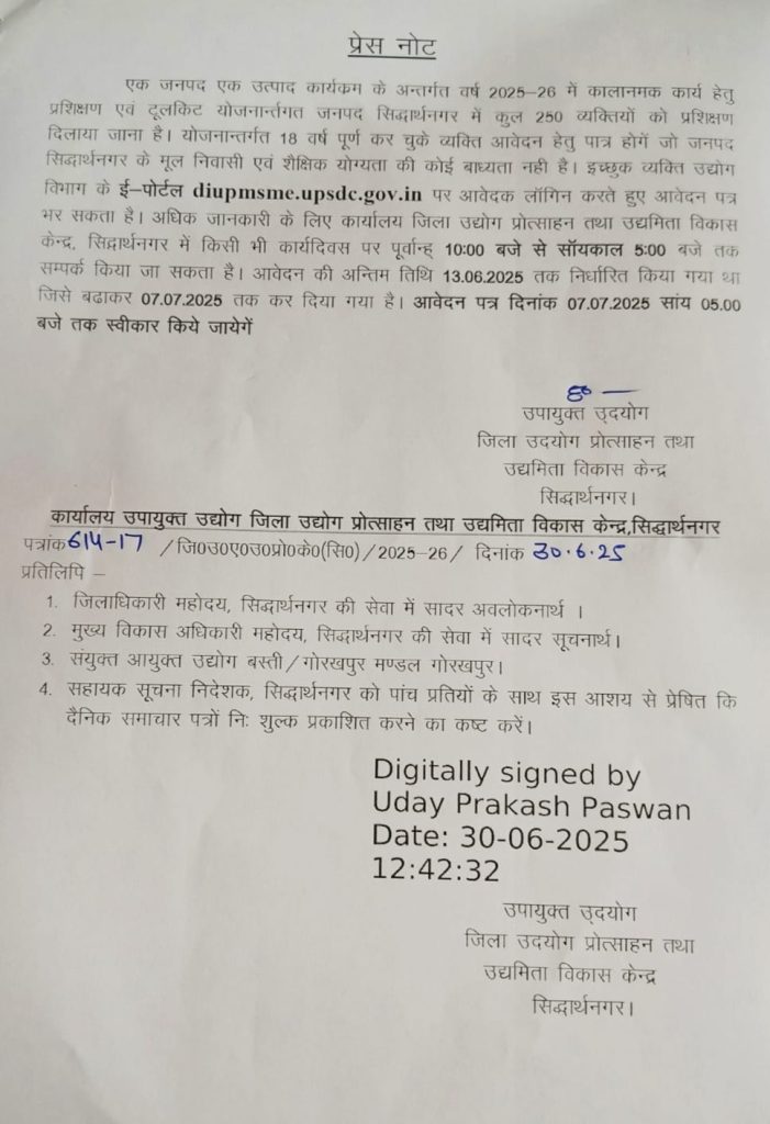 एक जनपद एक उत्पाद कार्यक्रम के अन्तर्गत वर्ष 2025-26 में कालानमक कार्य हेतु प्रशिक्षण एवं टूलकिट योजनान्तर्गत जनपद सिद्धार्थनगर में कुल 250 व्यक्तियों को प्रशिक्षण दिलाया जाना है। योजनान्तर्गत 18 वर्ष पूर्ण कर चुके व्यक्ति आवेदन हेतु पात्र होगें, जो जनपद सिद्धार्थनगर के मूल निवासी एवं शैक्षिक योग्यता की कोई बाध्यता नहीं है। इच्छुक व्यक्ति उद्योग विभाग के ई-पोर्टल diupmsme.upsdc.gov.in पर आवेदक लॉगिन करते हुए आवेदन पत्र भर सकता है। अधिक जानकारी के लिए कार्यालय जिला उद्योग प्रोत्साहन तथा उद्यमिता विकास केन्द्र सिद्धार्थनगर में किसी भी कार्यदिवस पर पूर्वान्ह 10:00 बजे से सॉयकाल 5:00 बजे तक सम्पर्क किया जा सकता है। आवेदन की अन्तिम तिथि 13.06.2025 तक निर्धारित किया गया था, जिसे बढ़ाकर 07.07.2025 तक कर दिया गया है। आवेदन पत्र दिनांक 07.07.2025 सांय 05.00 बजे तक स्वीकार किये जायेगें। उक्त जानकारी जिला उद्योग प्रोत्साहन तथा उद्यमिता विकास केन्द्र सिद्धार्थनगर उपायुक्त उद्योग ने दी है।