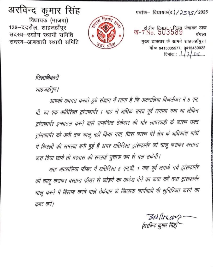 आज ददरौल भाजपा विधायक अरविंद कुमार सिंह जी ने जिलाधिकारी शाहजहांपुर धर्मेंद्र प्रताप सिंह जी से भेंट कर अपने निर्वाचन क्षेत्र ददरौल के अंतर्गत विभिन्न विद्युत उपखंडों से शासन की मंशानुरूप विद्युत आपूर्ति करवाने एवं वृक्षारोपण डी०ए०पी० एवं युरिया खाद व अन्य जनहित के विषयों के निराकरण हेतु लिखित पत्र दिए।