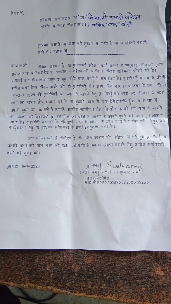 पलिया कलां खीरी:- पलिया कला के निवासी पटीहन रोड अजीत नगर की महिला ने अपने पति पर मारपीट करने तथा जान से मारने का प्रयास करने जैसे गंभीर आरोप लगाए हैं। पीड़िता का कहना है कि उसका पति 2 जुलाई 2025 को उसके साथ मारपीट की और दीवाल में उसका सर जान से मारने की नीयत से लड़ा दिया महिला का यह भी आरोप है कि उसका पति अपनी 16 साल की बेटी के सामने अश्लील गालियां भी देता है और मुझे मेंटल घोषित करने के लिए पूरे मोहल्ले में अफवाह फैला रखी है कि इस महिला का दिमाग कम है महिला का यह भी कहना है कि वह हमारे साथ लगातार मारपीट करता है और हमें और हमारी बेटी को हमे पढ़ाई लिखाई के लिए खाने के लिए किसी भी तरह का की खर्च नहीं देता है महिला का कहना है कि जिस मकान में उसका पति दुकान करके बैठा है वह मकान उसका है शिकायतों के बावजूद भी प्रशासन उसे पर कोई कार्रवाई नहीं कर रहा है। यदि हमारे साथ कोई घटना होती है मैं मर जाती हूं तो उसकी मृत्यु को मौत नहीं बल्कि मर्डर समझा जाए क्योंकि मैं हार मानने वाले और आत्महत्या करने वाले में से नहीं हूं महिला का कहना है कि वह इस मामले की शिकायत कई बार संबंधित अधिकारियों से कर चुकी है किंतु उसके बाद भी कोई कार्यवाही नहीं हो रही है अगर उसके साथ कोई भी जान माल की अप्रिय घटना होती है तो उसका जिम्मेदार उसका पति होगा।