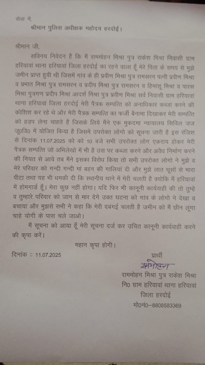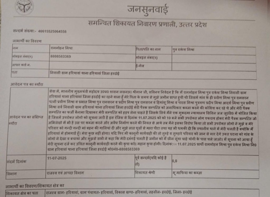 राममोहन पिता राकेश मिश्रा निवासी हरियावां पिता के समय से जमीन प्राप्त हुई थी जिसमें गांव के लोग पैतृक सम्पत्ति को अनाधिकार कब्जा करने की कोशिश कर रहे हैं मेरी पैतृक संपत्ति का फर्जी बैनामा दिखाकर मेरी सम्पत्ति को हड़प लेना चाहते हैं जिससे मैने sp हरदोई में सूचना दी है और जनसुनवाई पोर्टल पर भी सूचना दी है।