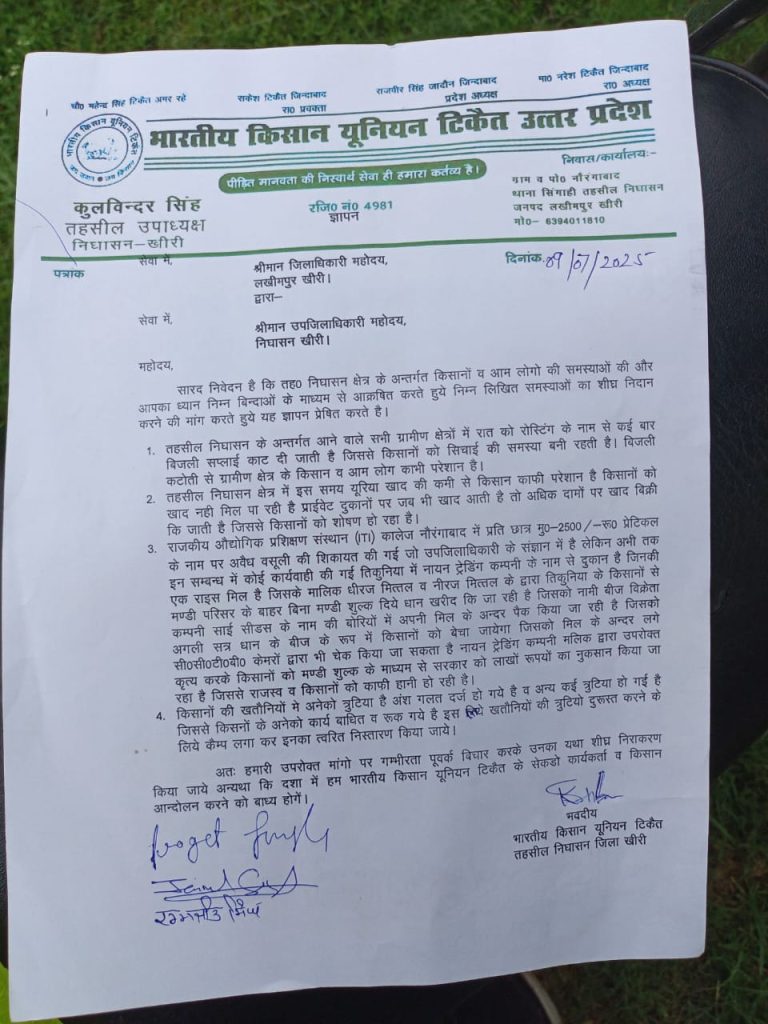 ज्ञापन में बताया गया है तहसील निघासन के ग्रामीण क्षेत्रों में रात को “रोस्टिंग” के नाम पर बार-बार बिजली आपूर्ति बाधित की जा रही है। इससे सिंचाई कार्य प्रभावित हो रहे हैं और किसान रातभर परेशान रहते हैं। बिजली कटौती आमजन के लिए भी असुविधा का कारण बन रही है। संगठन ने आरोप लगाया कि क्षेत्र में यूरिया खाद की भारी कमी है। सरकारी वितरण नाकाफी है और प्राइवेट दुकानों पर खाद उपलब्ध होते ही मनमाने दाम वसूले जा रहे हैं, जिससे किसानों का शोषण हो रहा है।किसान यूनियन ने तिकुनिया स्थित नायन ट्रेडिंग कंपनी के मालिकों — धीरज मित्तल और नीरज मित्तल — पर गंभीर आरोप लगाते हुए कहा कि वे मंडी परिसर के बाहर बिना मंडी शुल्क अदा किए किसानों से धान खरीद रहे हैं। बाद में इस धान को साई सीड्स के नाम से अपनी मिल में पैक कर बीज के रूप में बेचा जा रहा है। यह कार्यवाही सीसीटीवी फुटेज से भी पुष्टि की जा सकती है। इससे सरकार को मंडी शुल्क में लाखों का नुकसान और किसानों को भारी हानि हो रही है। ज्ञापन में यह भी उल्लेख किया गया कि किसानों की खतौनियों में अनेक त्रुटियाँ हैं, जिससे उनके कई कार्य रुक गए हैं। किसानों की सुविधा के लिए विशेष कैम्प लगाकर खतौनियों की त्रुटियाँ जल्द से जल्द दूर करने की मांग की गई है। किसान यूनियन ने चेतावनी दी कि यदि प्रशासन ने उक्त समस्याओं का शीघ्र समाधान नहीं किया, तो भारतीय किसान यूनियन टिकैत के सैकड़ों कार्यकर्ता आंदोलन करने को बाध्य होंगे। ज्ञापन पर ।