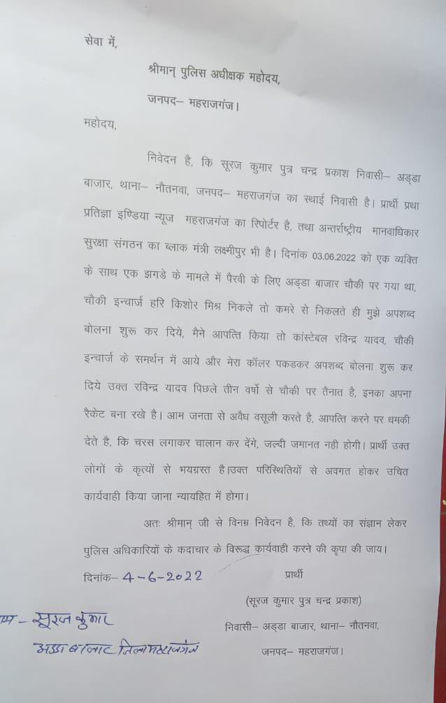 पीड़ित पत्रकार ने न्याय के लिए लिखा एस पी महराजगंज को प्रार्थना पत्र..