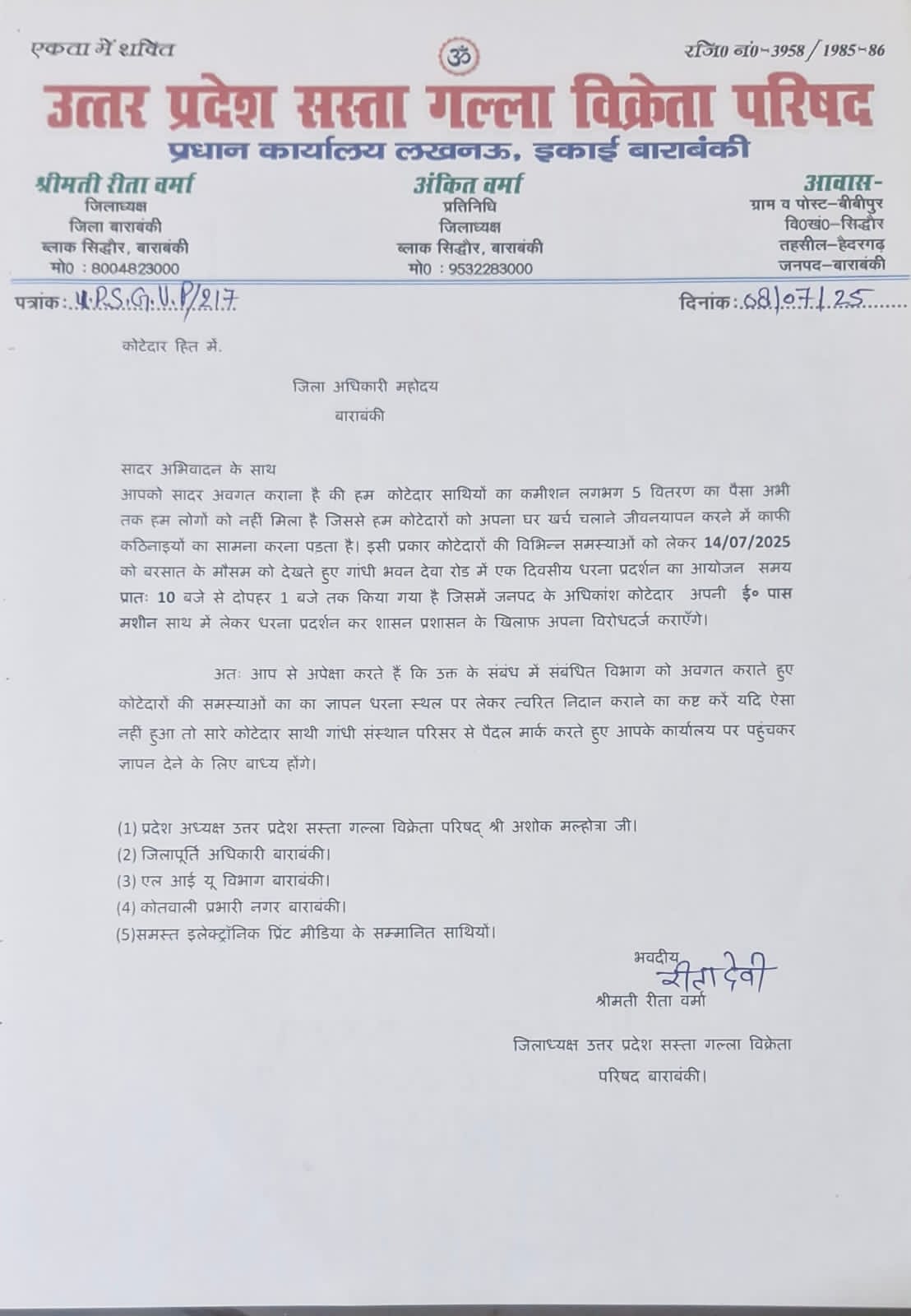बाराबंकी जिले के समस्त उचित दर विक्रेता उत्तर प्रदेश सस्ता गल्ला विक्रेता परिषद बाराबंकी की जिला अध्यक्ष महोदया श्रीमती रीता वर्मा की अगुवाई में दिनांक 14/07/2025 को गांधी भवन स्थित देवा रोड में अपनी विभिन्न मांगों को लेकर एक दिवसीय धरना प्रदर्शन करेगा।जिसमें कोटेदारों को लगभग 5 माह के राशन वितरण का लाभांश न मिलने एवं जून 2021 के राशन का चालान जो कोटेदारों द्वारा बैंक में जमा किया गया था उसका भी भुगतान आज तक कोटेदारों के खाते में वापस नहीं किया गया है।10 बजे से लेकर 1 बजे तक जिले के अधिकांश कोटेदार ई पांस मशीन लेकर शासन प्रशासन को अपना विरोध दर्ज कराएंगे।और धरना स्थल पर जिम्मेदारों को कोटेदारों की विभिन्न समस्याओं को लेकर ज्ञापन सौंपा जाएगा।