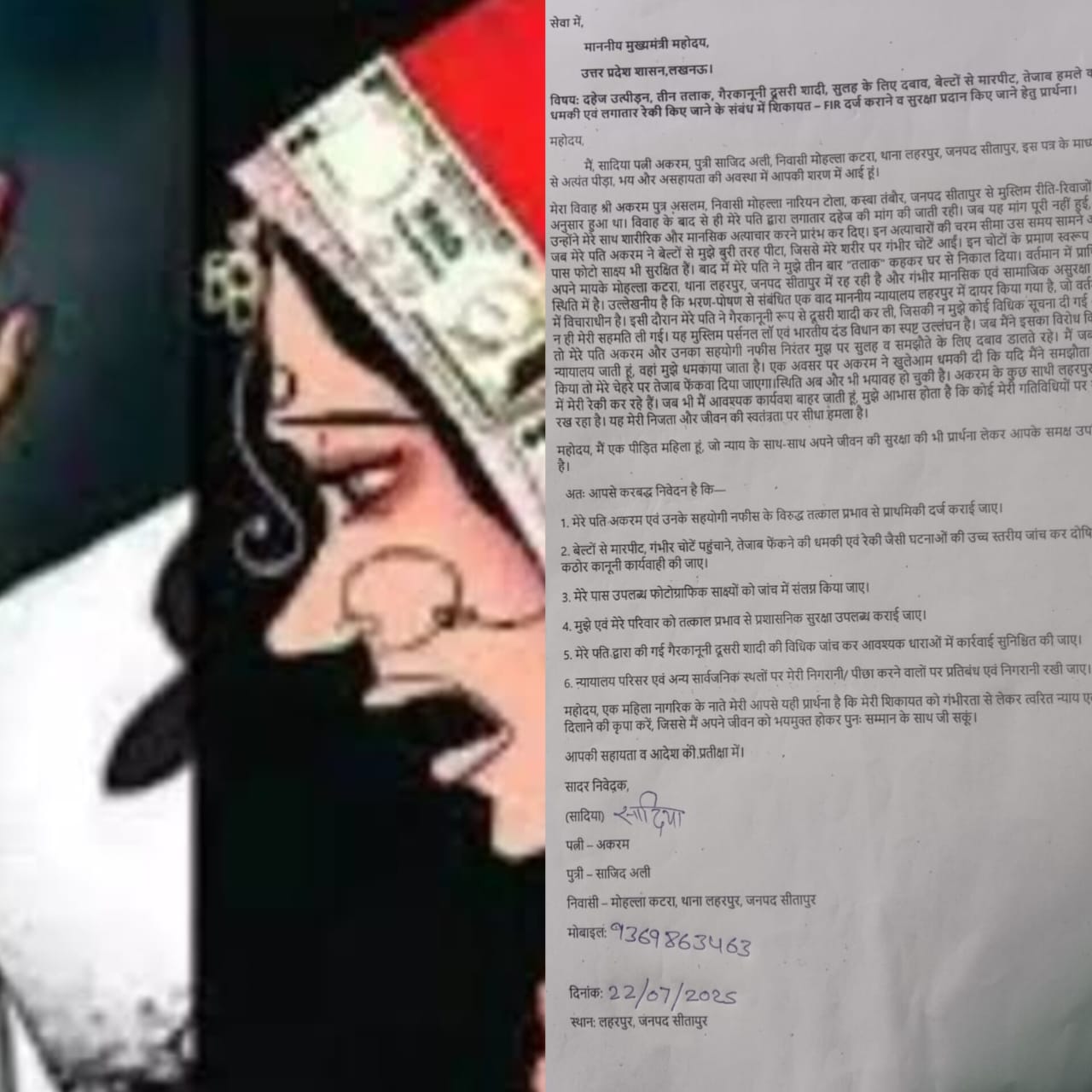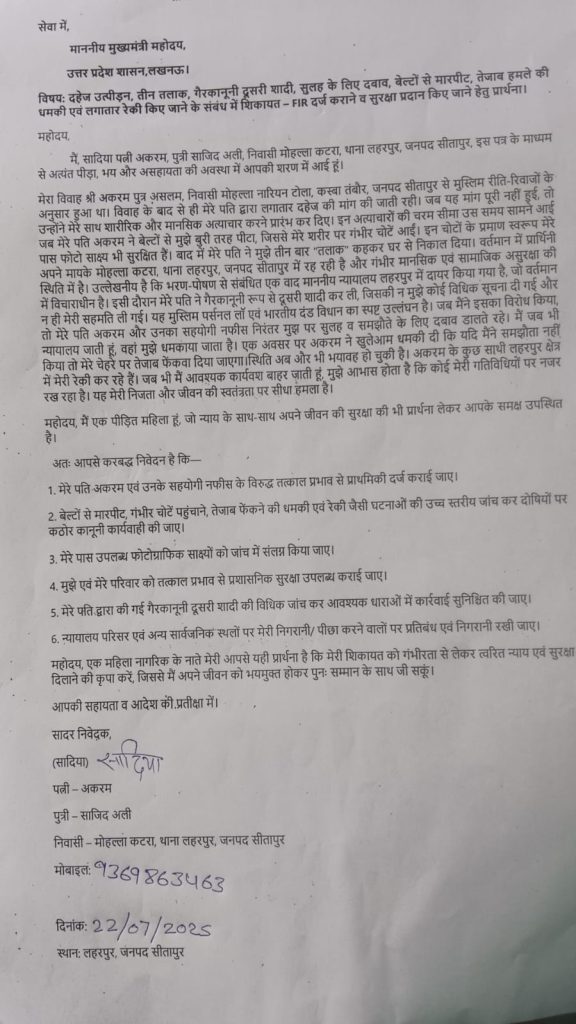 सीतापुर। जनपद सीतापुर के लहरपुर कस्बे की रहने वाली एक पीड़िता ने अपने पति और उसके सहयोगियों पर गंभीर आरोप लगाते हुए मुख्यमंत्री योगी आदित्यनाथ एवं उत्तर प्रदेश राज्य महिला आयोग को प्रार्थना पत्र सौंपा है। महिला ने आरोप लगाया है कि उसे दहेज के लिए प्रताड़ित किया गया, बेल्ट से पीटा गया, तीन तलाक देकर घर से निकाल दिया गया, और अब तेजाब फेंकने की धमकी दी जा रही है। पीड़िता ने मामले में सुरक्षा व न्याय की मांग की है। प्राप्त जानकारी के अनुसार पीड़िता सादिया का निकाह मुस्लिम रीति-रिवाजों के अनुसार अकरम पुत्र असलम, निवासी मोहल्ला नारियन टोला, कस्बा तंबौर से हुआ था। विवाह के बाद से ही उस पर दहेज लाने का दबाव बनाया जाता रहा, और मांग पूरी न होने पर मानसिक व शारीरिक उत्पीड़न शुरू हो गया। एक बार पति ने बेल्ट से बेरहमी से पीटा, जिससे उसके शरीर पर गंभीर चोटें आईं। पीड़िता ने इन चोटों के फोटोग्राफिक साक्ष्य भी अधिकारियों को उपलब्ध कराए हैं।इसके बाद पति अकरम ने उसे तीन बार “तलाक” कहकर घर से निकाल दिया। वर्तमान में पीड़िता अपने मायके मोहल्ला कटरा, थाना लहरपुर में रह रही है। इस बीच अकरम ने बिना किसी विधिक प्रक्रिया के दूसरी शादी भी कर ली, जिसकी न तो सूचना दी गई और न ही पहली पत्नी की सहमति ली गई। पीड़िता ने इसे मुस्लिम पर्सनल लॉ और भारतीय कानून का खुला उल्लंघन बताया है।पीड़िता ने यह भी बताया कि उसके द्वारा न्याय की मांग किए जाने के बाद आरोपी पक्ष लगातार सुलह का दबाव बना रहा है। यहां तक कि उसे न्यायालय परिसर तक में रोका गया और जान से मारने की धमकियां दी गईं। एक बार आरोपी ने यह धमकी तक दे डाली कि अगर उसने समझौता नहीं किया, तो उसके चेहरे पर तेजाब फेंकवा देगा।