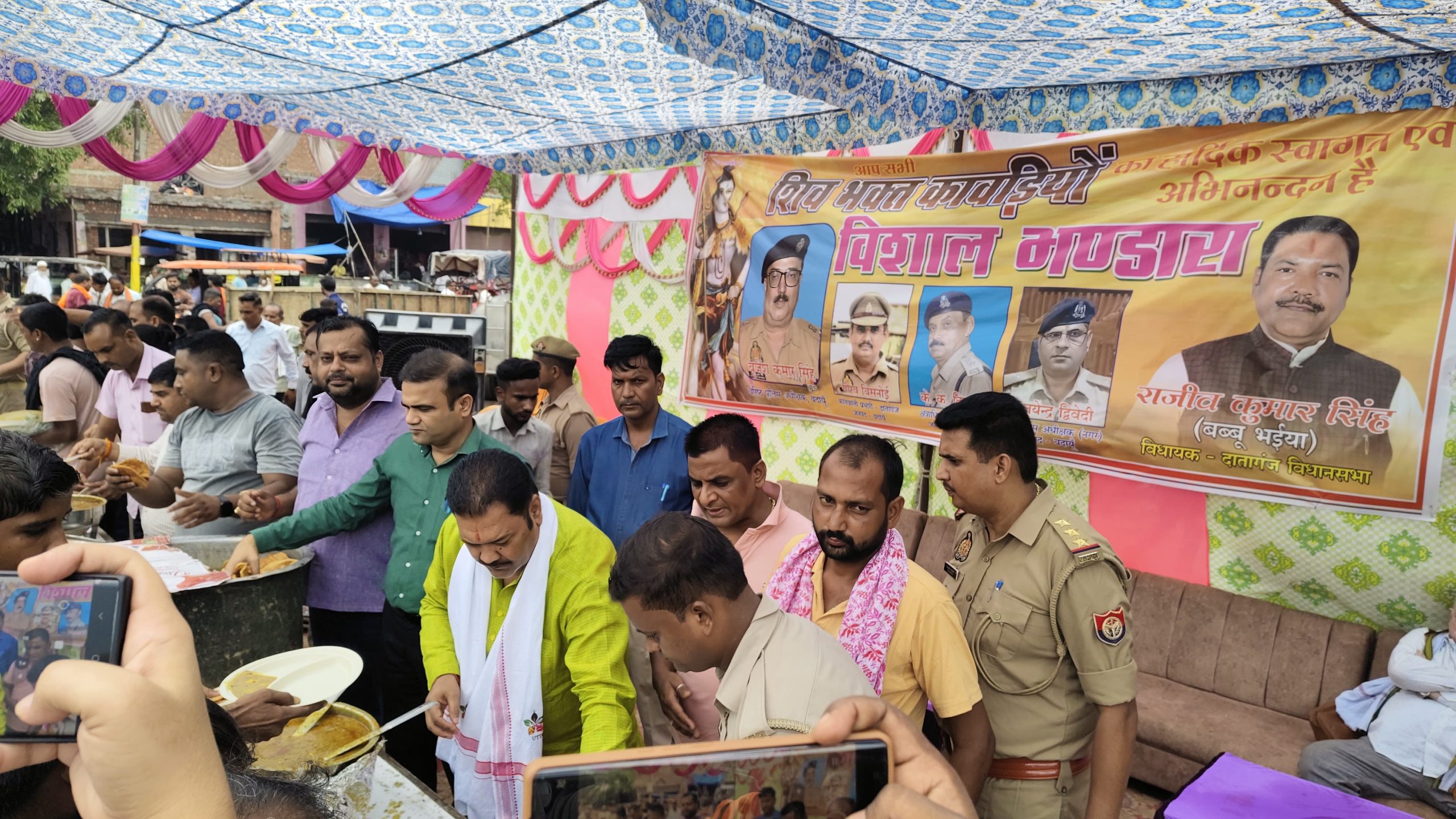 भंडारे में खीर, पूड़ी व सब्जी जैसे परसाद को ग्रहण करने के लिए भारी संख्या में उमड़े श्रद्धालुओं के बीच पहुंचकर क्षेत्रीय भाजपा विधायक राजीव कुमार सिंह व ब्लाक प्रमुख अतेन्द्र विक्रम सिंह ने उपजिलाधिकारी धर्मेन्द्र कुमार सिंह के साथ श्रद्धालुओं को परसाद वितरित किया। इस अवसर पर पुलिस क्षेत्राधिकारी के.के. तिवारी ने बताया हमारा पुलिस प्रशासन भी पूर्ण रूप से अपनी जिम्मेदारी निभा रहा है। और श्रद्धालुओं व कांवरियों की सुरक्षा व्यवस्था में किसी भी प्रकार की लापरवाही नही बरती जा रही है,उनको पूरा सम्मान दिया जा रहा है।