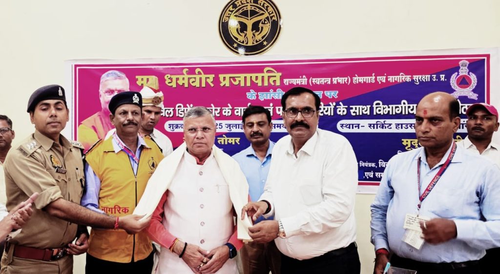 उत्तर प्रदेश झांसी से सोनू साहू चटर्जी की रिपोर्टझांसी। सर्किट हाउस झांसी में सिविल डिफेन्स की आयोजित बैठक के दौरान श्री धर्मवीर प्रजापति मान. राज्य मंत्री (स्वतन्त्र प्रभार) उ. प्र. होमगार्ड एवं सिविल डिफेन्स का नागरिक सुरक्षा कोर के प्रभारी/नगर मजिस्ट्रेट प्रमोद झा एवं चीफ वार्डन तथा कमाण्डिंग आफिसर आनन्द कुमार सक्सेना द्वारा मंत्री जी को बुके, शाॅल एवं स्मृति चिन्ह भेंट कर सम्मानित किया गया। सम्मान समारोह की श्रृंखला में जिला कमाण्डेण्ट होमगार्ड हरिशंकर चौधरी, डिप्टी चीफ वार्डन शील कोपरा, वरि. सहा.उपनियन्त्रक सुनील सिंह, डिवीजनल वार्डन कोतवाली विनय सिजरिया, डिवी. वार्डन नगरा भूपेंद्र पाल खत्री, डिवी. वार्डन रिजर्व अतुल अग्रवाल किलपन, डिप्टी डिवी. वार्डन संदीप गुप्ता, स्टाफ आफिसर टू डिवी. वार्डन अनूप वर्मा सहित दोनों प्रखण्डो के आईसीओ, पोस्ट वार्डन, सेक्टर वार्डन एवं फायर फाइटर द्वारा भी मौ मंत्री जी को बुके एवं माल्यार्पण भेंट कर स्वागत किया गया।