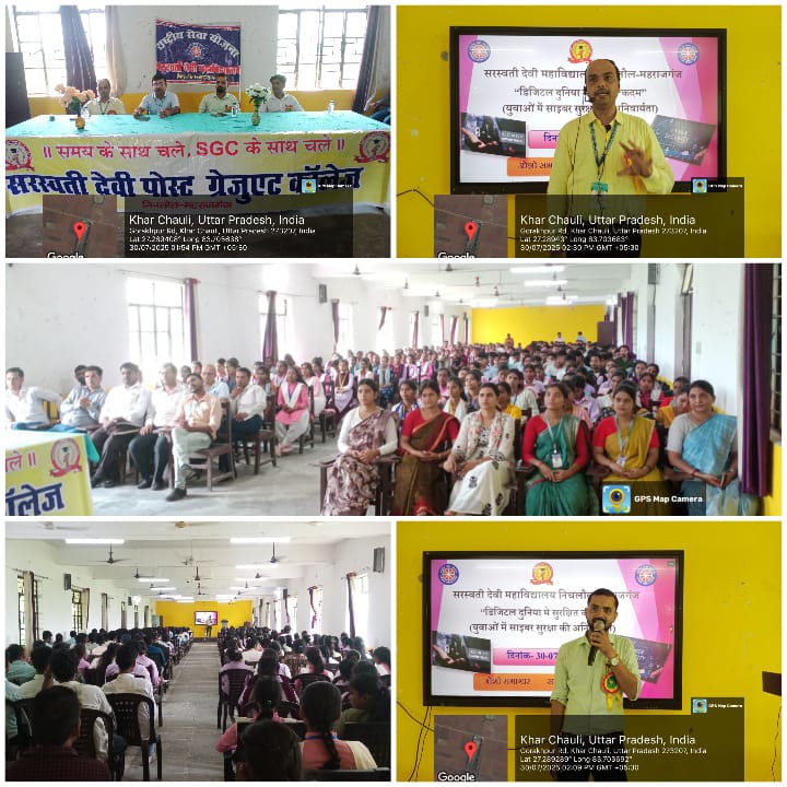 कार्यक्रम में मुख्य अतिथि: डा सुनील पाण्डेय (प्राचार्य सरस्वती देवी महाविद्यालय निचलौल ) रहे उन्होंने छात्र छात्राओं को संबोधित करते हुए कहा कि आज के डिजिटल युग में युवा वर्ग इंटरनेट और तकनीकी संसाधनों का सबसे अधिक उपयोग करता है। सोशल मीडिया, ऑनलाइन बैंकिंग, ई-लर्निंग और डिजिटल संवाद के बढ़ते प्रयोग के साथ साइबर अपराधों का खतरा भी तेजी से बढ़ा है। ऐसे में युवाओं के लिए साइबर सुरक्षा का ज्ञान और उसका पालन अत्यंत अनिवार्य हो गया है।