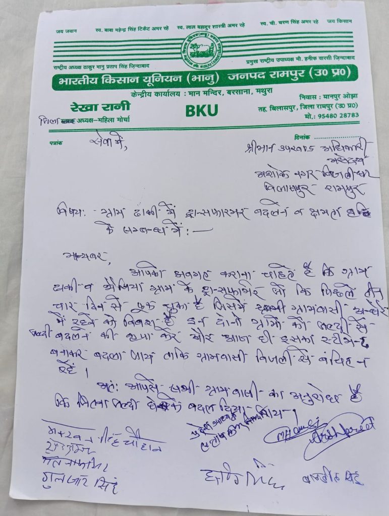 ब्रेकिंग न्यूज़ संवाददाता,,,,,,, एम डी न्यूज़,,,,,,,,,,,,,,,,,,, आज दिन अंक 1 अगस्त को भारतीय किसान यूनियन भानू तह सुधा कार्यक्रम के तहत 11:00 बजे जिला महासचिव सरदार मक्खन सिंह चौहान के नेतृत्व में अशोकनगर बिजली घर पर दरिया बिछाकर धरने पर बैठ गए इसकी सूचना प्रमुख राष्ट्रीय उपाध्यक्ष मोहम्मद हनीफ वारसी जी को जिला महासचिव द्वारा दी गई सूचना पाते ही 12:30 बजे श्री वारसी धरना स्थल पर पहुंच गए धरने को संबोधित करते हुए प्रमुख राष्ट्रीय उपाध्यक्ष मोहम्मद हनीफ वारसी ने कहा कि अधिकारी किसानों के प्रति अपना रवैया बदले समय से किसानों की समस्याओं का समाधान करें 5 दिन से ग्राम ढांकी का ट्रांसफार्मर फूंका हुआ ह किसानों द्वारा क्षेत्रीय J E से शिकायत के बावजूद भी ग्रामवासियों को अंधेरे में रखा गया ऐसी लापरवाही बर्दाश्त नहीं की जाएगी धरने के बीच में बैठे एसडीओ ने भरोसा दिलाया भविष्य में दोबारा मेरे रहते हैं ऐसी शिकायत नहीं मिलेगी मेरे संज्ञान में आज ही सुबह यह मैटर आया है भैंसिया ज्वालापुर एवं अन्य कई जगह की केवल फुके ट्रांसफार्मर आदि ग्राम ढकी के ट्रांसफर में क्षमता बढ़ाई जाने का ज्ञापन सोपा गया चेतावनी देते हुए अगर भविष्य में किसानों को दिक्कत आई तो जिम्मेदार अधिकारियों को बांदा बनाएगी भारतीय किसान यूनियन भानू धरने की अध्यक्षता सतनाम सिंह ने की एवं संचालन प्रांतीय उपाध्यक्ष संतोष कुमार सिकदर ने किया वक्ताओं में देवेंद्र सिंह सतनाम सिंह मनप्रीत सिंह वजीर सिंह गुलजार सिंह बचन सिंह गुरप्रीत सिंह सुरेंद्र सिंह बंटी गुरमीत सिंह पिंडर सिंह दारा सिंह पतिराम हरपाल सिंह हरजीत सिंह मुराद खान आदि शामिल रहे/ रामपुर से रफीउल्लाह खान की स्पेशल रिपोर्ट