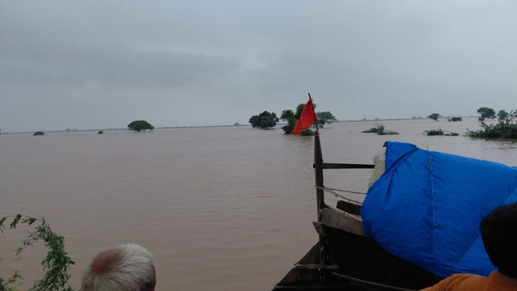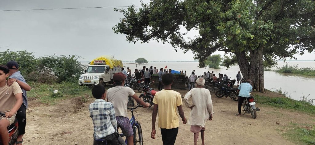 जहां पर लोगों को नाविकों की सहायता से जरूरी समान पहुचा रहे प्रसाशन के लोग और ग्रामीण इलाकों में झुसी थाना के अंतर्गत आने वाले कई गाव हेतापट्टी बदरा सोनौटी आदि गाव में पानी भर गया है जहां पर आने जाने का सम्पर्क टूट गया है बाढ़ का पानी अभी खतरे के निशान से सिर्फ 1 सेंटी मीटर ही रह गया है।