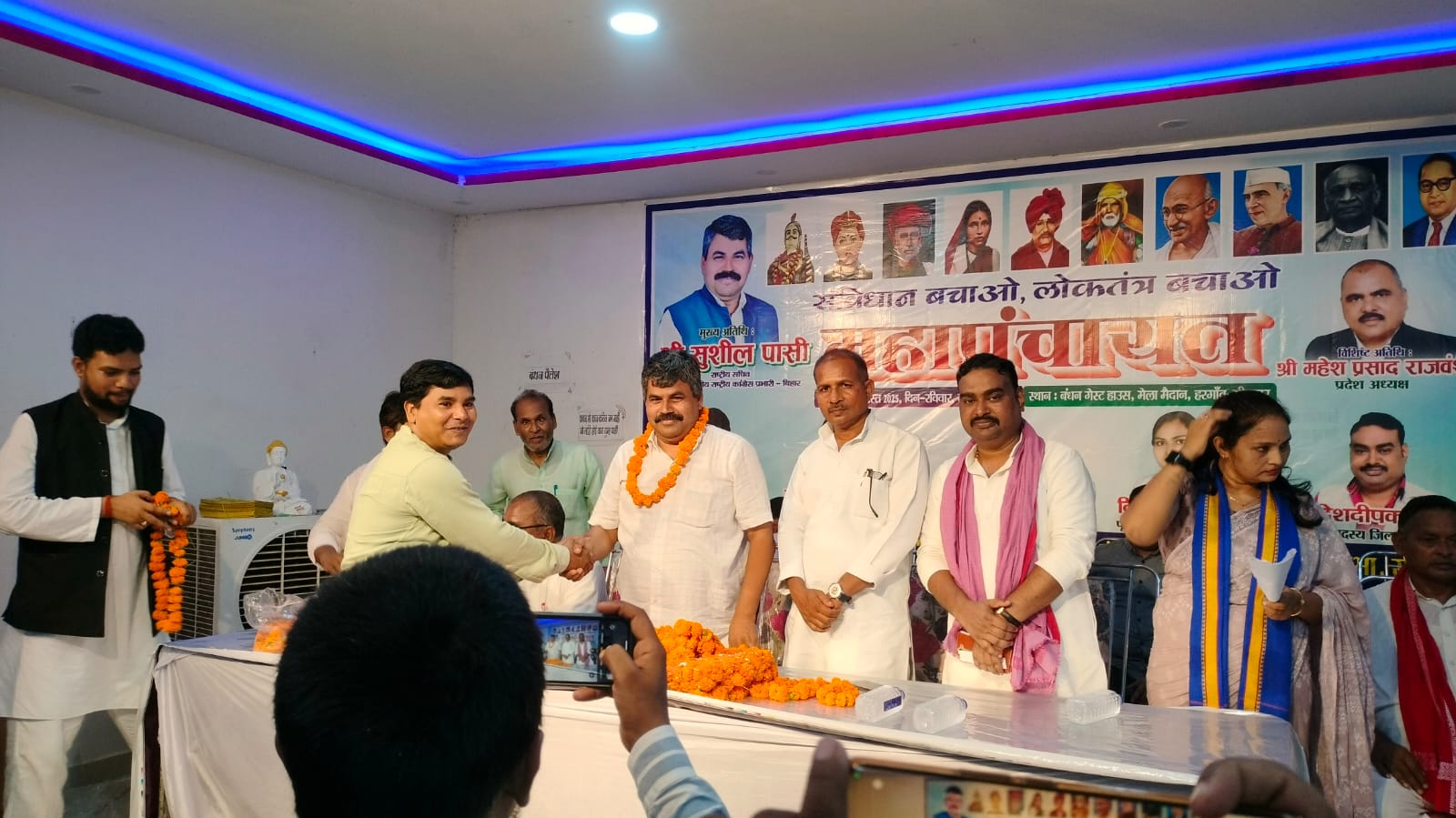 हरगांव सीतापुर —- हरगांव के मेला मैदान मार्ग पर स्थित गेस्ट हाउस मे पी डी ए के बैनर तले संविधान बचाओ,लोकतंत्र बचाओ, महापंचायत आयोजित की गयी।जिसमे मुख्य अतिथि राष्ट्रीय सचिव अखिल भारतीय कांग्रेस कमेटी व बिहार राज्य के प्रभारी सुशील पासी ने सम्बोधित किया उन्होंने भाजपा सरकार पर कटाक्ष कर सम्बोधित किया कि महगाई काफी हद तक बढ गई, गरीब परेशान है कही कोई सुनवाई नही हो रही है, पी डी ए के लोगों को सताया जा रहा है, गुंडा माफिया शासन प्रशासन पर हावी है बलात्कार, हत्या भाजपा शासन मे आम बात है, युवाओं के लिए सरकार के पास कुछ भी नहीं है हम कांग्रेस के लोग भाजपा को उखाड़ फेंकने के लिए समान विचारों वाले दलों के साथ गठबंधन से नहीं हिचकेंगे। संविधान को न मानने वाली इस सरकार को उखाड़ फेंकने के लिए हम लोग हर जगह पंचायत कर रहे हैँ। इस क्रम अधिक से अधिक लोगों को जोड़ा जा रहा है।महिला नेत्री विनीता राजवंशी ने कहा कि भाजपा सरकार मे भृष्टाचार की कोई सीमा नही है महिलाए सुरक्षित नही है आम लोगो का जीना दुश्वार है इस महा पचांयत मे प्रमुख रूप से भाकपामाले, किसान यूनियन, समाज वादी पार्टी, छीता पासी संगठन के लोग उपस्थित रहे।कार्यक्रम के आयोजक सन्तोष भार्गव पूर्व शहर अध्यक्ष काग्रेस पार्टी सीतापुर,जिला पंचायत सदस्य अर्जुन लाल, राजेश सिँह तोमर, देश दीपक भार्गव,महेश प्रसाद पासी,विजय वर्मा,बरसात के मौसम मे इस कार्यक्रम मे काफी संख्या मे महिला और पुरूष कार्यकर्ता उपस्थित रहे।