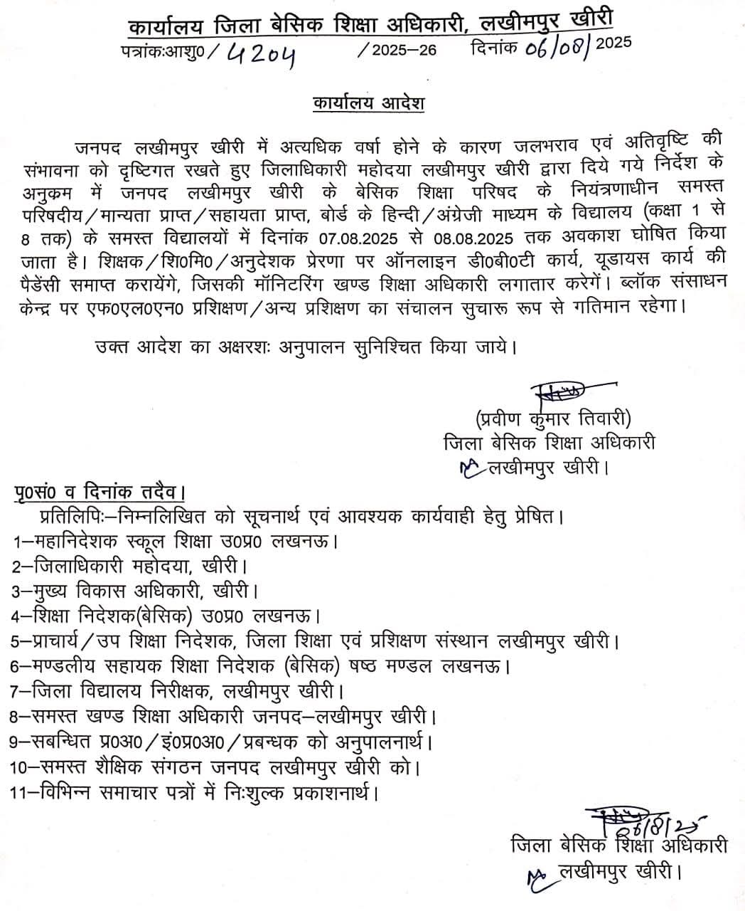 जनपद में हो रही अत्यधिक वर्षा को देखते हुए कक्षा 8 तक के बच्चों के सभी स्कूलों की 8 अगस्त तक छुट्टी की गई।