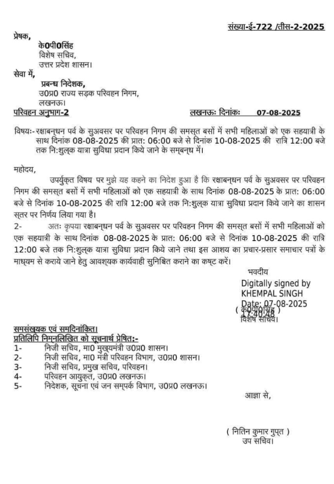 यूपी।रक्षाबंधन के मौके पर यूपी रोडवेज की सभी तरह की बसों में महिलाओं का सफर तीन दिन तक फ्री रहेगा। खास बात यह है कि इसमें एक सहयात्री को भी टिकट नहीं पड़ेगा।