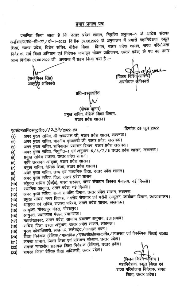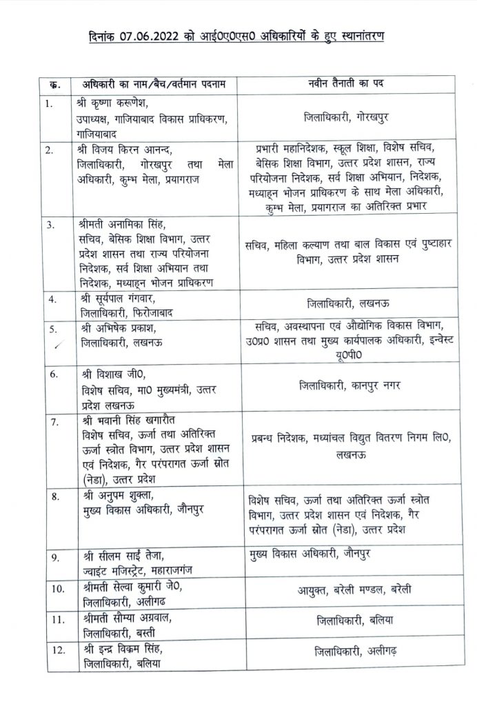 धर्मेन्द्र कसौधन(ब्यूरो):यूपी सरकार ने मंगलवार को बड़ा प्रशासनिक फेरबदल करते हुए 21 आईएएस अफसरों को बदल दिया। गोरखपुर के जिलाधिकारी विजय किरन आनंद को एक बार फिर बेसिक शिक्षा विभाग का विशेष सचिव एवं स्कूल शिक्षा महानिदेशक के पद पर तैनाती दी गई है। उनके पास कुंभ मेला अधिकारी प्रयागराज का अतिरिक्त प्रभार भी रहेगा।