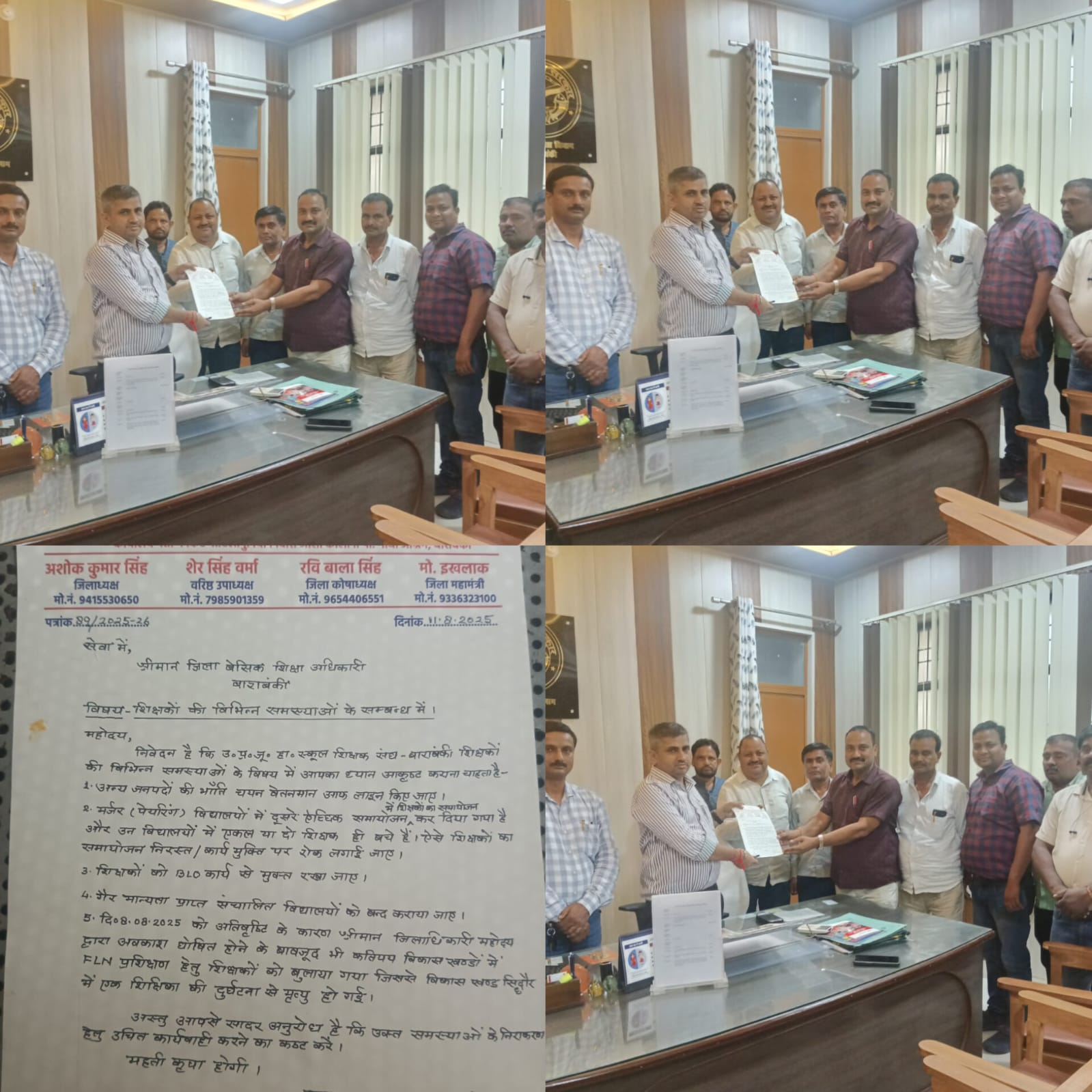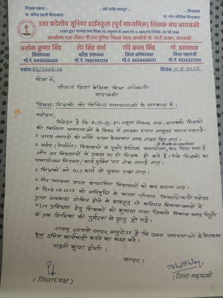 बाराबंकी: शिक्षकों के जनवरी 2025 से लंबित पड़े चयन वेतनमान, युग्मन होने से एकल हुए विद्यालय, 8 अगस्त को सड़क हादसे में शिक्षिका शिक्षा मल्होत्रा के असामयिक निधन और शिक्षकों को बीएलओ कार्य से मुक्त रखने के संबंध में और शिक्षकों की विभिन्न समस्याओं के संबंध में ज़िला अध्यक्ष अशोक कुमार सिंह के नेतृत्व में सोमवार को उत्तर प्रदेशीय जूनियर हाईस्कूल शिक्षक संघ का प्रतिनिधिमंडल जिला बेसिक शिक्षा अधिकारी संतोष कुमार देव पाण्डेय से मिला और विभिन्न समस्याओं पर बात की।