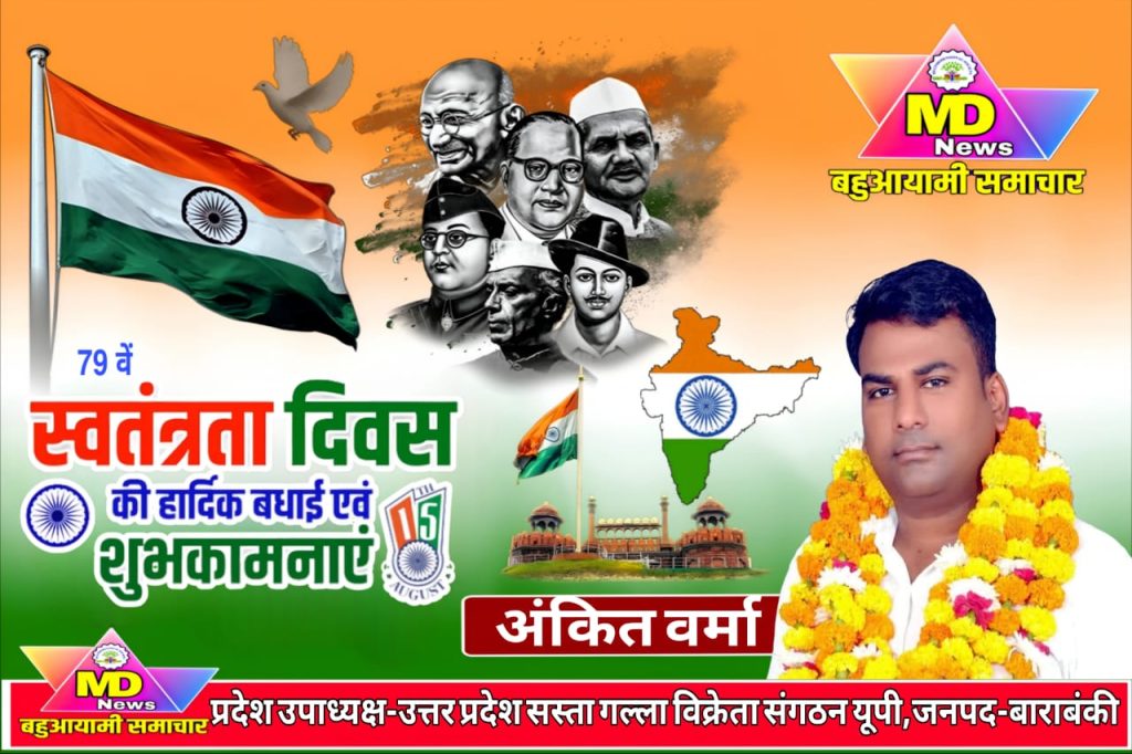 बाराबंकी:अंकित वर्मा-प्रदेश उपाध्यक्ष उत्तर प्रदेश सस्ता गल्ला विक्रेता संगठन, यूपी जनपद-बाराबंकी के तरफ से आप सभी क्षेत्रवासियों एवं देशवासियों को 79वें स्वतंत्रता दिवस की हार्दिक शुभकामनाएं..