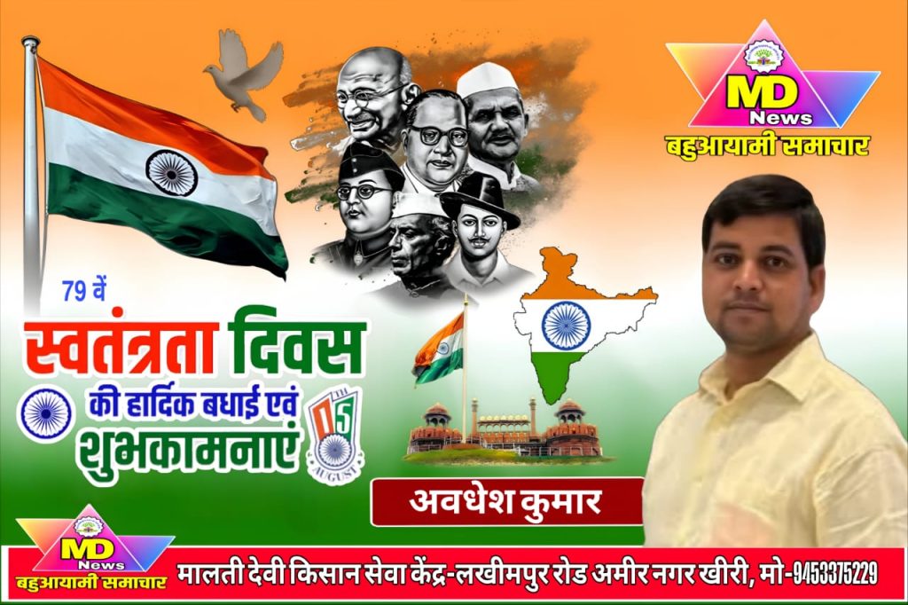 लखीमपुर खीरी:अवधेश कुमार-मालती देवी किसान सेवा केंद्र लखीमपुर रोड अमीर नगर खीरी की तरफ से समस्त क्षेत्रवासियों को 79वें स्वतंत्रता दिवस की हार्दिक शुभकामनाएं..