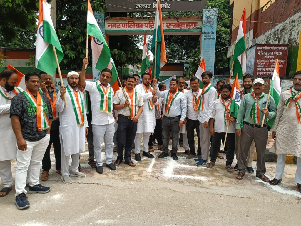 स्योहारा ।स्वतंत्रता दिवस से पूर्व “हर घर तिरंगा – घर घर तिरंगा” अभियान के अंतर्गत बुधवार को नगर पालिका परिषद स्योहारा द्वारा एक भव्य तिरंगा यात्रा का आयोजन किया गया। दोपहर 12 बजे नगर पालिका कार्यालय से आरंभ हुई यह यात्रा देशभक्ति के जोश और उत्साह के बीच नगर की मुख्य गलियों से गुज़री।
