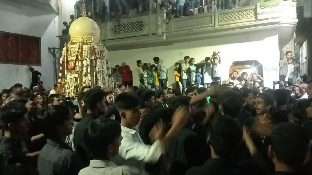 वाराणसी चेहल्लुम ताजिया वा ज़ुलजना अलम जुलूस या हुसैन या अब्बास या सकीना की सदाएं लगी जुलूस शांति पूर्वक जिला प्रशासन की मौजूदगी में निकाला गया!वाराणसी से संवादाता सलीम जावेद जनपद वाराणसी में हर वर्ष की तरह इस बार भी चेहल्लुम ज़ुलजना अलम व ताजिया का जुलूस निकाला गया ताजिया के मुतवल्ली जौहर अली और दुल दुल के मुतवल्ली मुख्तार हुसैन के दौलत खाने से उठा कर कदमी रास्ते होते हुए रसूलपुरा इमाम चौक के पास पहुंचा उसके बाद ताजिया व अलम उठाया गया नौहा खानी मातम हुआ ताजिया 12,,8,,2025 को रसूलपुरा इमाम चौक पर दोपहर 3 बजे रखा जाता है और उसके बाद सभी शिया समुदाय के मर्द और खवातीन दूर दूर से जियारत करने के लिए आने जाने का सिलसिला पूरी रात व दिन चलता रहता है वहीं क्षेत्रीय बच्चे बुजुर्ग महिलाओं की भी चहल पहल रहती है बनारस की कई अंजुमन भी ताजिया के पास ज़ियारत कर नौहे व मातम पेश करते हैं 13,,8,,2025 को शाम थाना बृजेश मिश्रा के जैतपुरा प्रभारी के नेतृत्व में जुलूस रसूलपुर ईमान चौक से दुल आलम का जुलूस साथ ताजिया के साथ शामिल होकर शाम 7 बजे उठाया गया,हर वर्ष के भांति इस वर्ष भी अपने कदमी रास्ते बकरा बाद मैदान ,,ओरिपुरा,, तेलियाना,,, बड़ीबजार,, छःमोहानी ,, थाना जैतपुरा गेट,, औशनगंज चौराहा,, डी ए वी कॉलेज,, तिराहा से नाटी इमली चौराहा होते हुए बुनकर कॉलोनी से गब्बू मामबाड़ा में ठंडा किया जाता है जंजीर से छोटे छोटे बच्चे और बुजुर्ग ने सीना ज़ानी करते हुए लहूलुहान कर शहीदों को याद किया इमामबाड़ा सभी शहीदों को याद कर लोगो की आंखे नम हो जाती है ताजिया व दुल दुल के मुतवल्ली ने बताया कि इस जुलूस में सुन्नी व हिंदू सभी लोग मन्नते लेकर आते हैं और दुल को दूध पिलाती है फूल माला भी पेश करती है यह परंपरा कई वर्ष से होते हुए आ रही है इस पूरे जुलूस की ज़ीनत अंजुमन अंसारें हुसैनी रसूलपुर बनारस रहती है कार्यक्रम के संयोजक जफर अली अलमदार हुसैन एडवोकेट,, मुबारक अली आदि लोगों की मौजूदगी में संपन्न होता है समय-समय पर शांति व्यवस्था यातायात व्यवस्था बनाए रखने में समाज सेवा सोसायटी उत्तर प्रदेश जिला वाराणसी के वालंटियर भी पूरे जुलूस में समाप्ति तक जिला पुलिस प्रशासन के साथ कंधा से कंधा मिलाकर मौजूद रहे ; जुलूस में पूरे रास्ते भारी पुलिस बल भी मौजूद रही!
